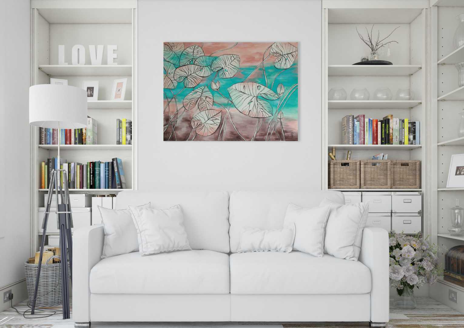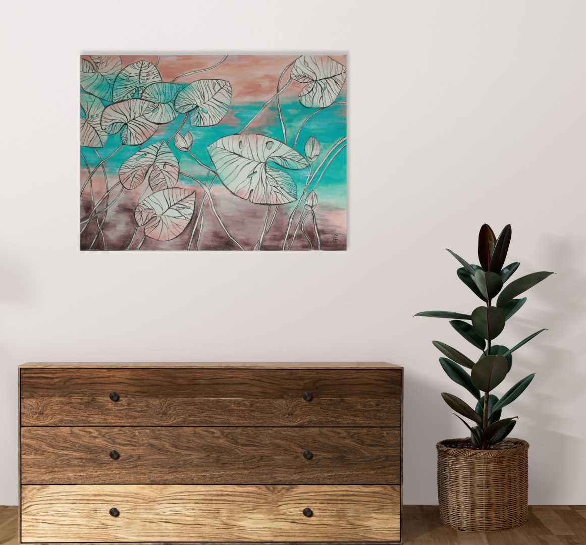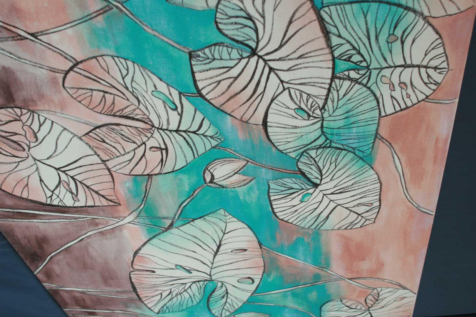 Нежный бирюзовый цвет плавно перетекает в теплые розово-коралловые оттенки сверху и приглушенные коричневые тона снизу. Детально прорисованные прожилки на л
