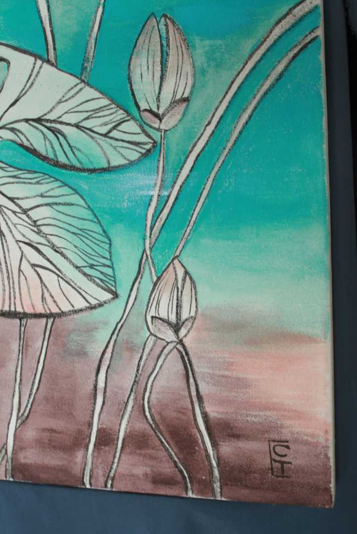 Работа выполнена на хлопковом холсте без грунта акриловыми красками для ткани: контурный рисунок черными линиями сочетается с градиентом.