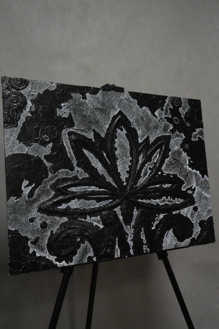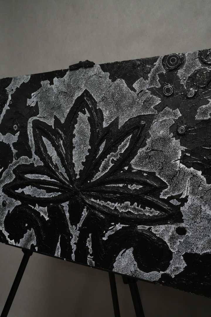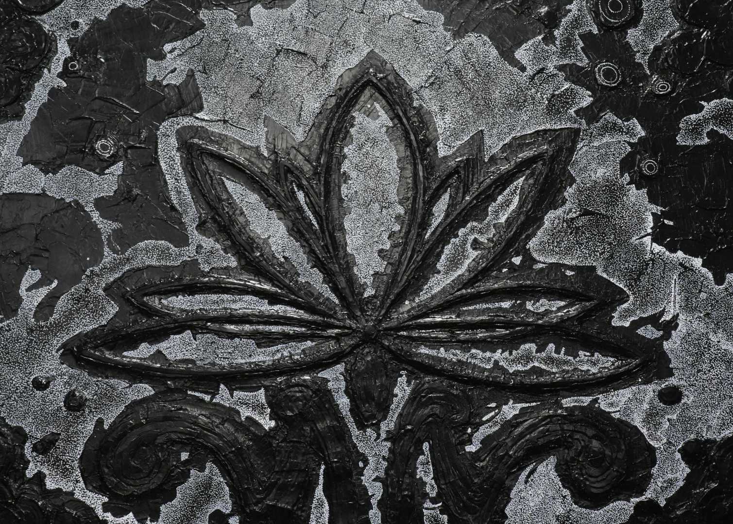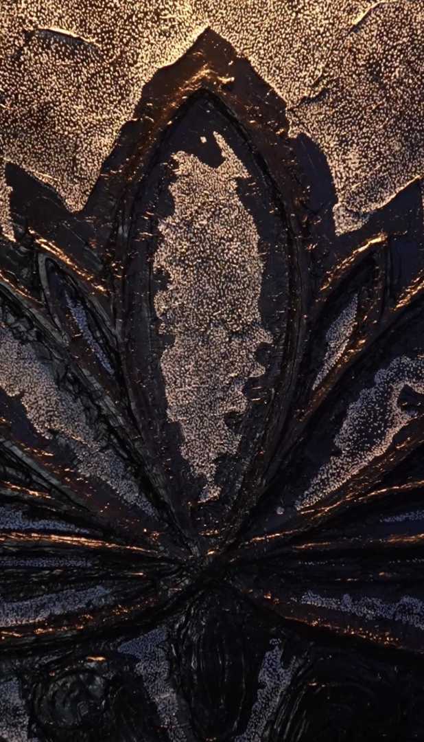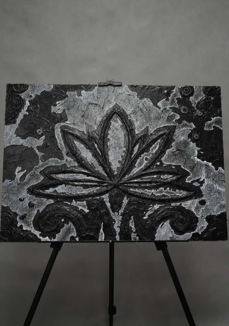 Монохромная, фактурная живопись, в центре которой — условный цветок/лотос, вылепленный акриловой пастой. Работа играет контрастом рельефа и равномерного песочного узора, создавая ощущение глубины и медитативного ритма.