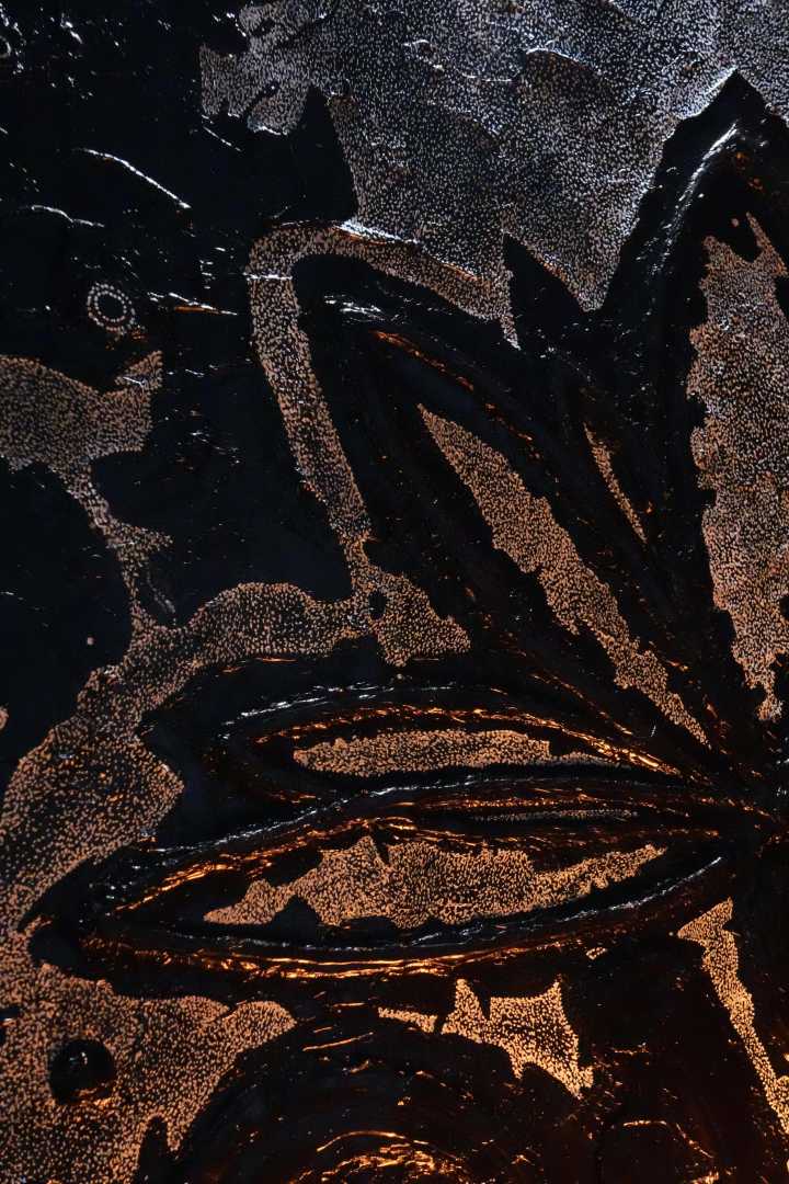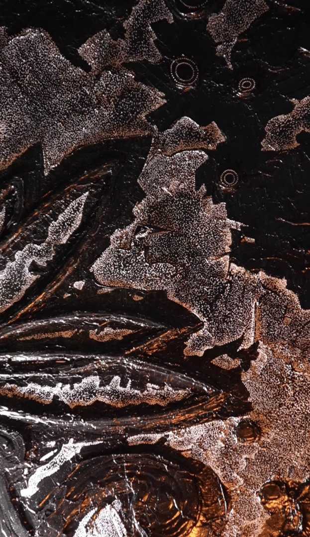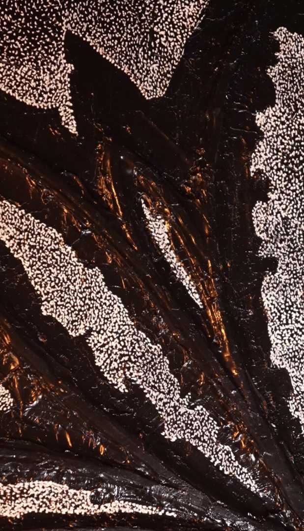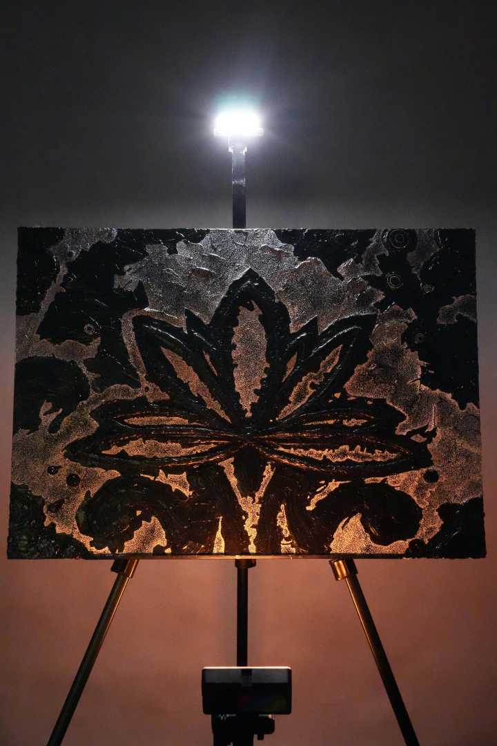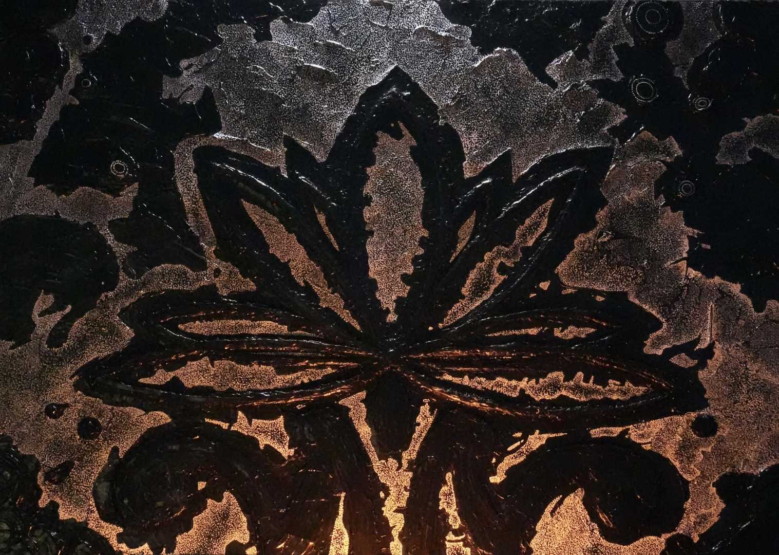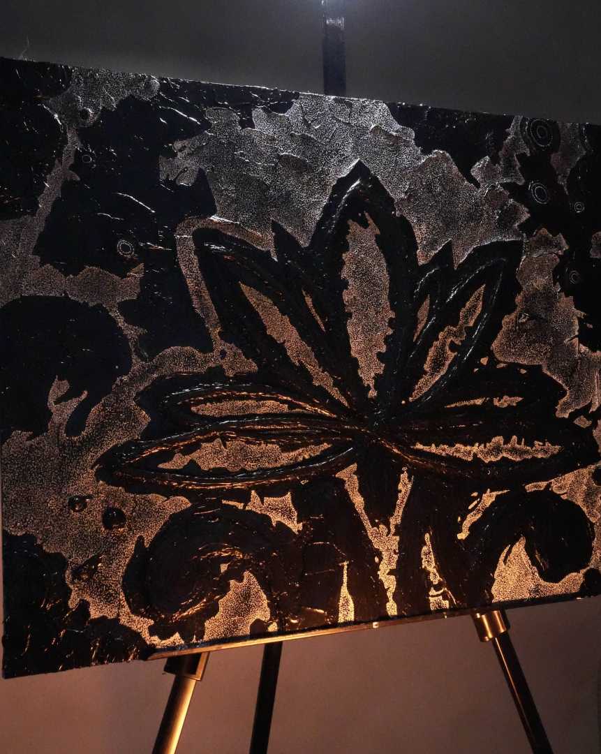 Монохромная, фактурная живопись, в центре которой — условный цветок/лотос, вылепленный акриловой пастой. Работа играет контрастом рельефа и равномерного песочного узора, создавая ощущение глубины и медитативного ритма.