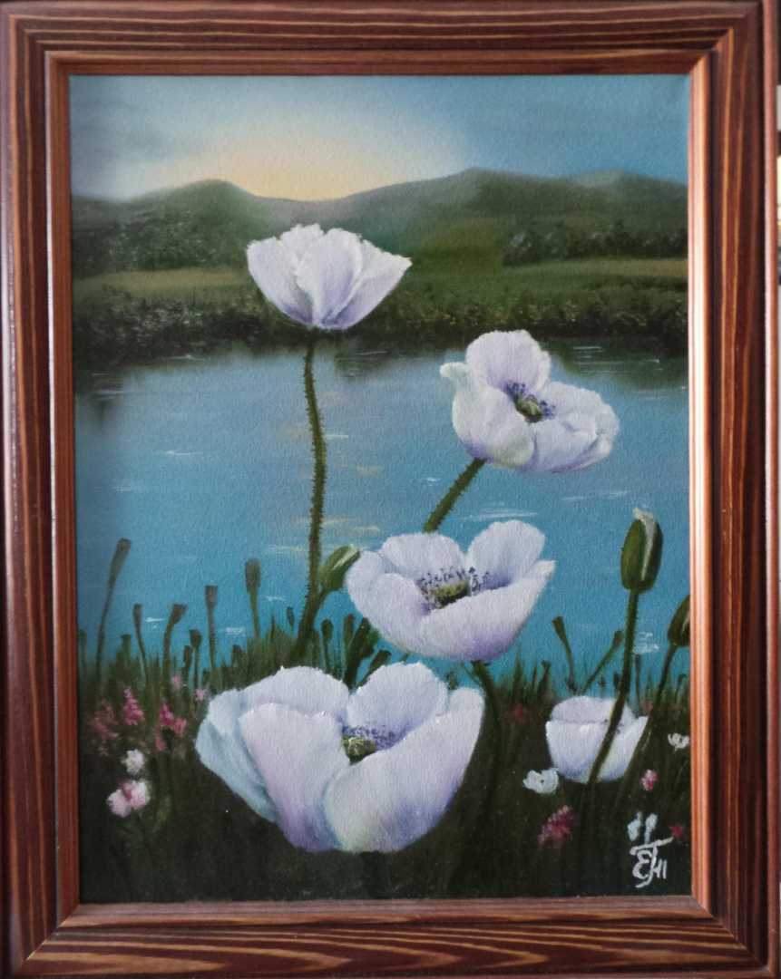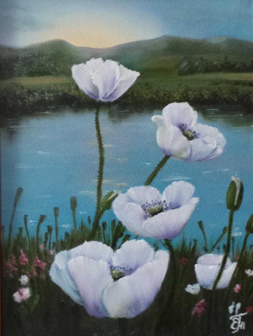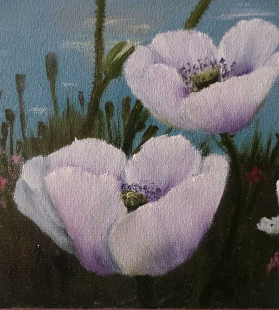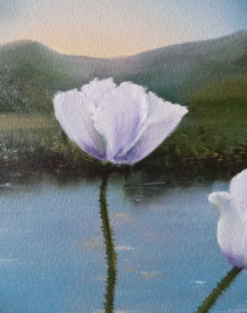 Живописное изображение природы в утренний час. Белые маки, освещенные первыми лучами восходящего солнца, символизируют жизнь, страсть и красоту, подчеркивая хрупкость и мимолетность момента. величественные горные вершины на заднем плане, едва различимый легкий туман,