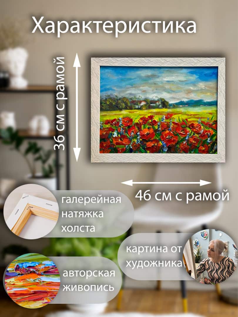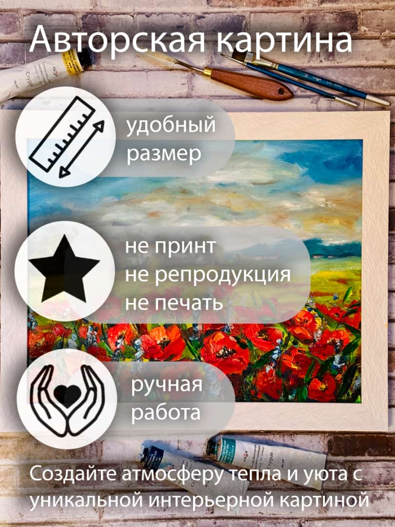 Маки — это символ процветания, радости и вдохновения. Яркие алые лепестки на холсте кажутся живыми благодар