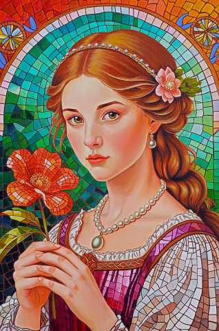 Яркая абстрактная работа, вдохновлённая витражной эстетикой. Переплетение цветовых форм и чётких линий создаёт ощущение движения, глубины и света, словно картина наполнена внутренней жизнью.
