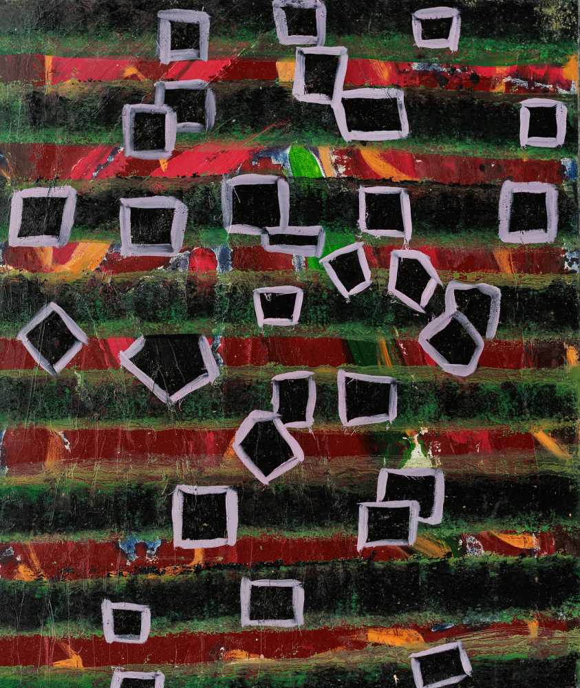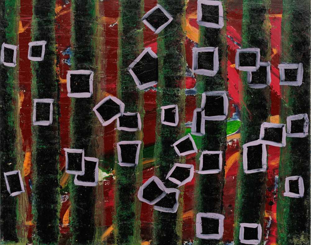 Картина «Россыпь» написана на ДВП, снятом со старой тумбочки. Мне нравится использовать такие поверхности - они уже прожили свою жизнь, впитали время и память. Когда я начинаю писать на них, чувствую, будто продолжаю чью-то историю. На заднем плане картины - горизонтальные полосы, похожие на горизон
