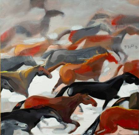 атмосферу свободы и мощи с этой яркой картиной маслом. На полотне изображён величественный табун лошадей, стремительно бегущих по мелководью, словно танцующие под закатным небом. Тёплые оттенки заката, отражённые в воде, подчёркивают гармонию силы и красоты природы, а энергия и грация лошадей вызывают ощущение вдохновения и движения. Эта картина — символ свободы, дикости и бескрайней красоты природы.