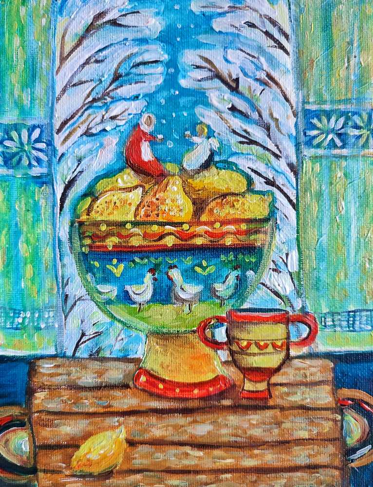 Самовар, сладости и чашка чая создают образ традиционного уютного вечера. Насыщенные цвета и выразительная манера письма делают работу живой и эмоциональной.