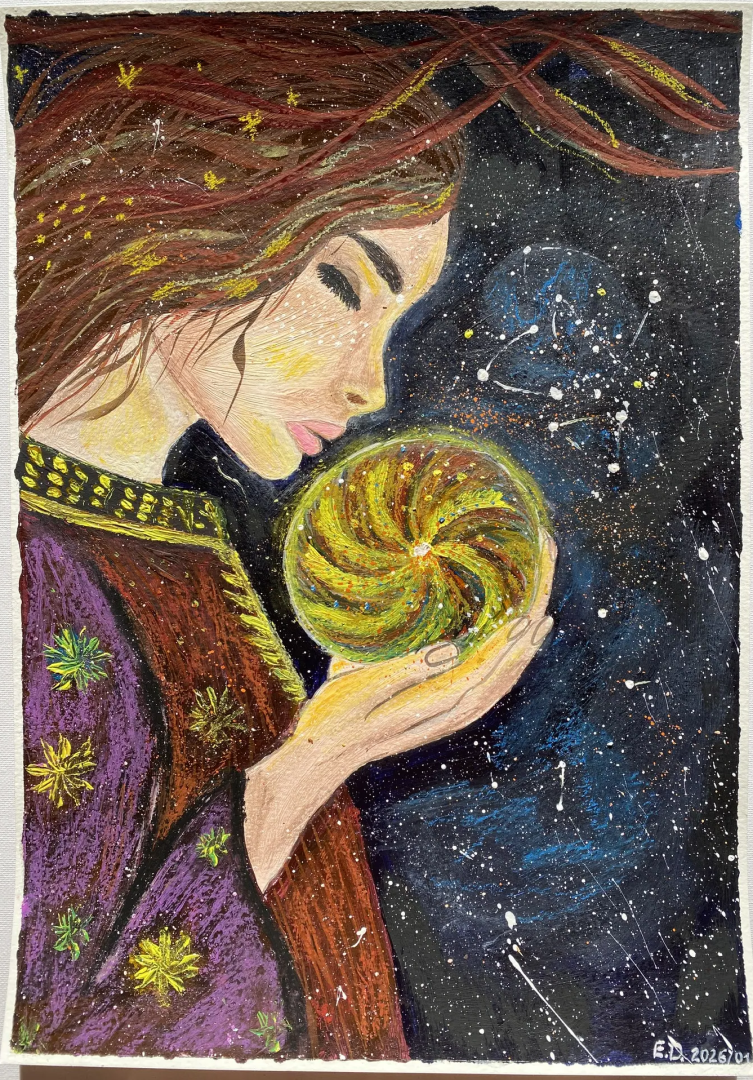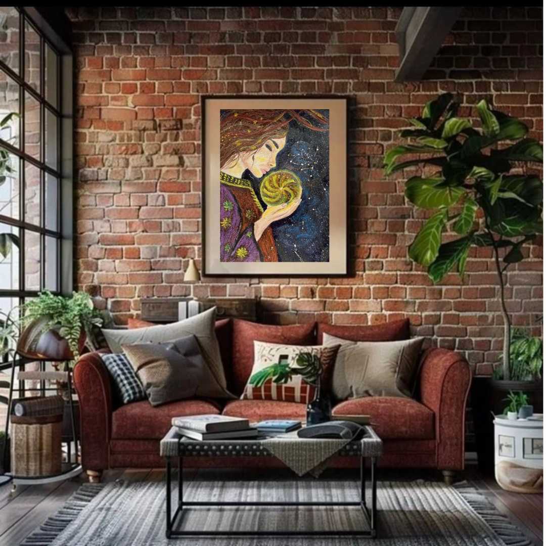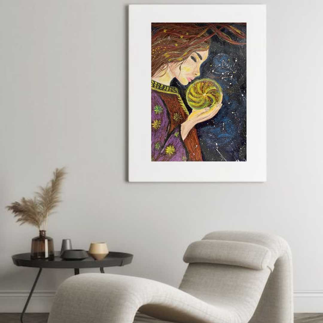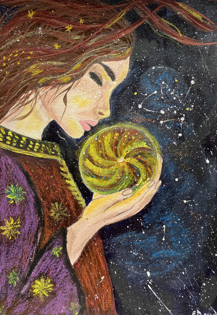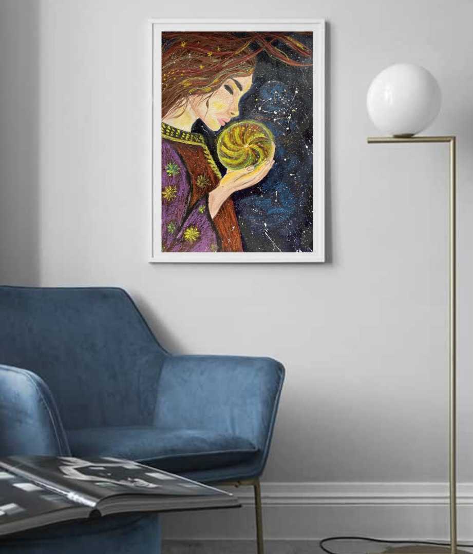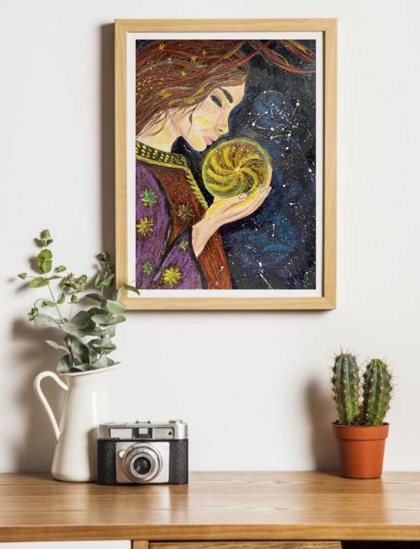 Картина «Внутренняя вселенная» — это визуальная медитация о силе, которая живёт внутри каждого из нас. Центральный образ — женщина, бережно держащая светящееся ядро, символ жизненной энергии, памяти и нераскрытого потенциала. Её закрытые глаза и спокойная поза говорят о глубоком доверии к внутреннем