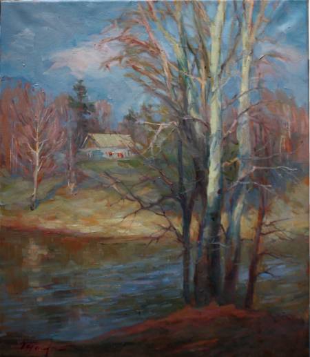 Я написала эту работу в студии. На этой картине изображена старинная русская усадьба "Грачевка". Я решила интерпретировать этот пейзаж в необычных цветах - фиолетовом и синем