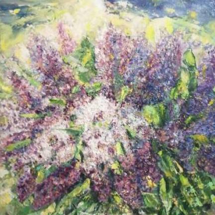Мозаика Сирень создана из витражного стекла. Сама сирень и карзина выполнены в технике микромазаики. Затем тессоры увеличиваются в размере. Картина очень изящная. Очень тонкое сочетание цветов и оттенков. Мозаика имеет поспарту и раму.