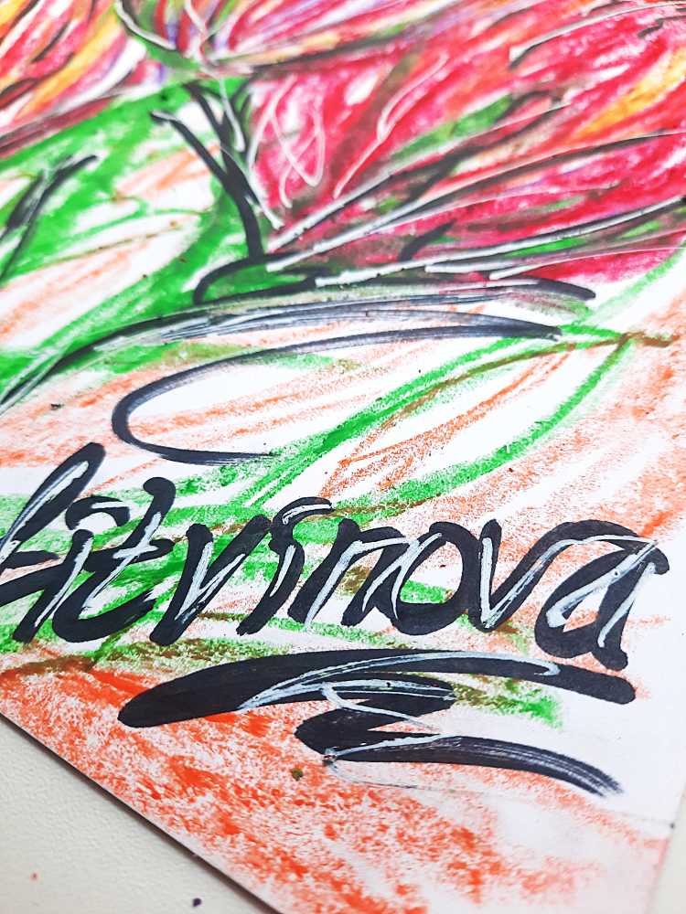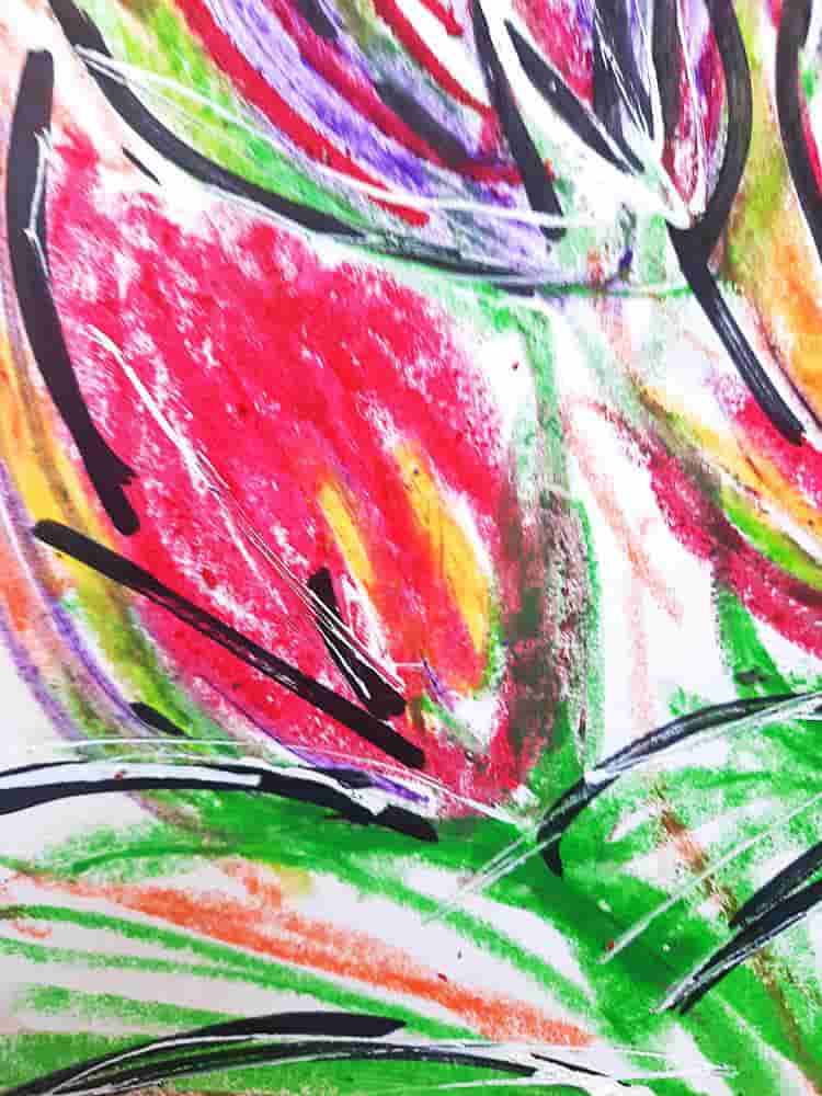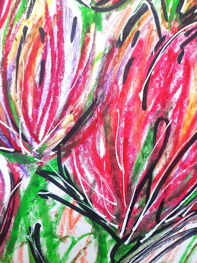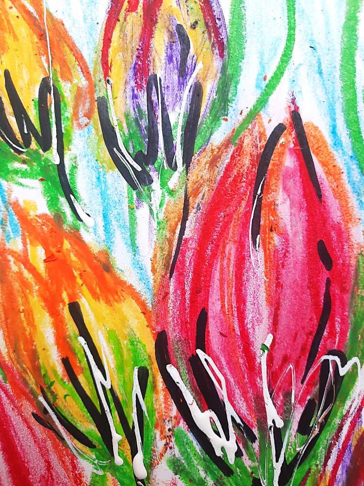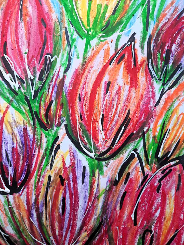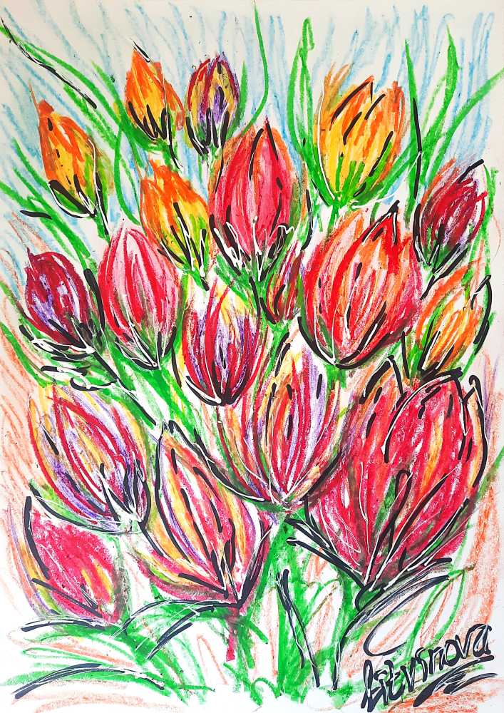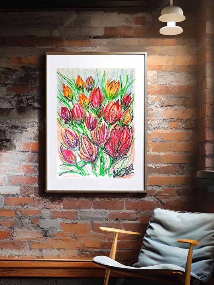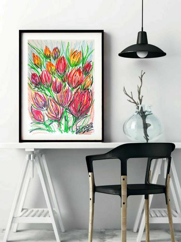 На картине раскрывается жизнерадостный и яркий образ тюльпанов, переданных в наивном стиле с насыщенными оттенками красного, розового и оранжевого. Контрастные черно-белые линии добавляют композиции выразительности и движения, усиливая ощущение живой энергии.