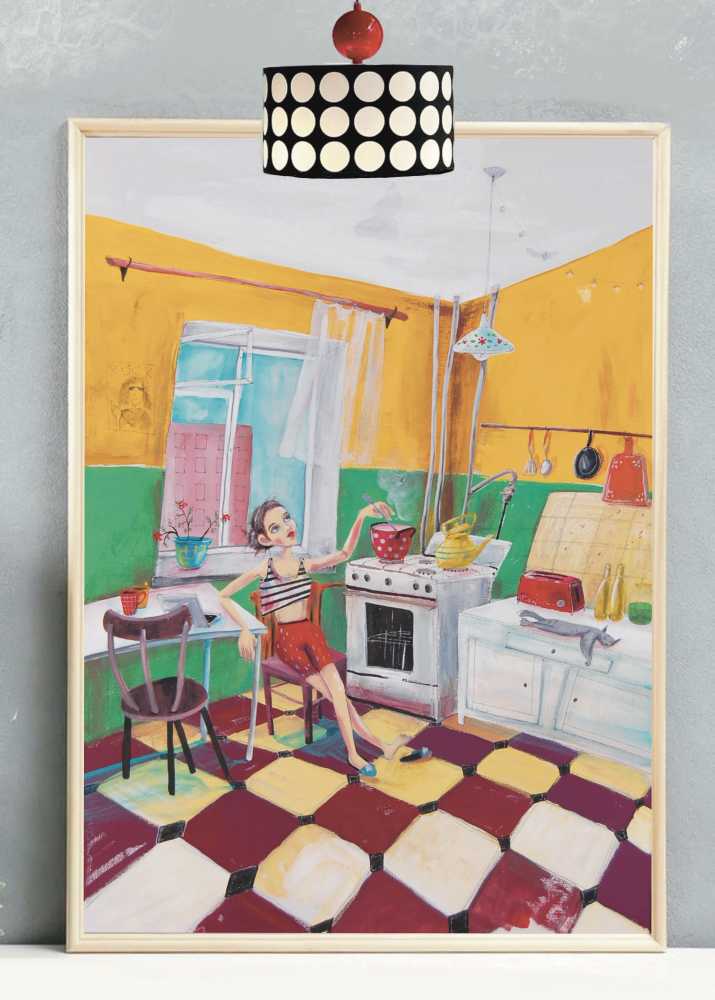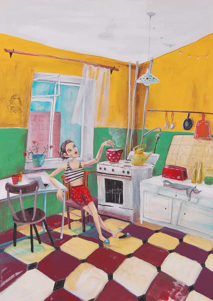 комичном утрированном стиле. Мы видим молодую девушку, сидящую на кухне. Она мечтает о будущем, а может просто влюблена и думает об этом парне. Кто знает. Одновременно она помешивает что-то готовящееся на плите. На столе ноутбук: может она слушает музыку, может смотрит сериал. Кот отдыхает