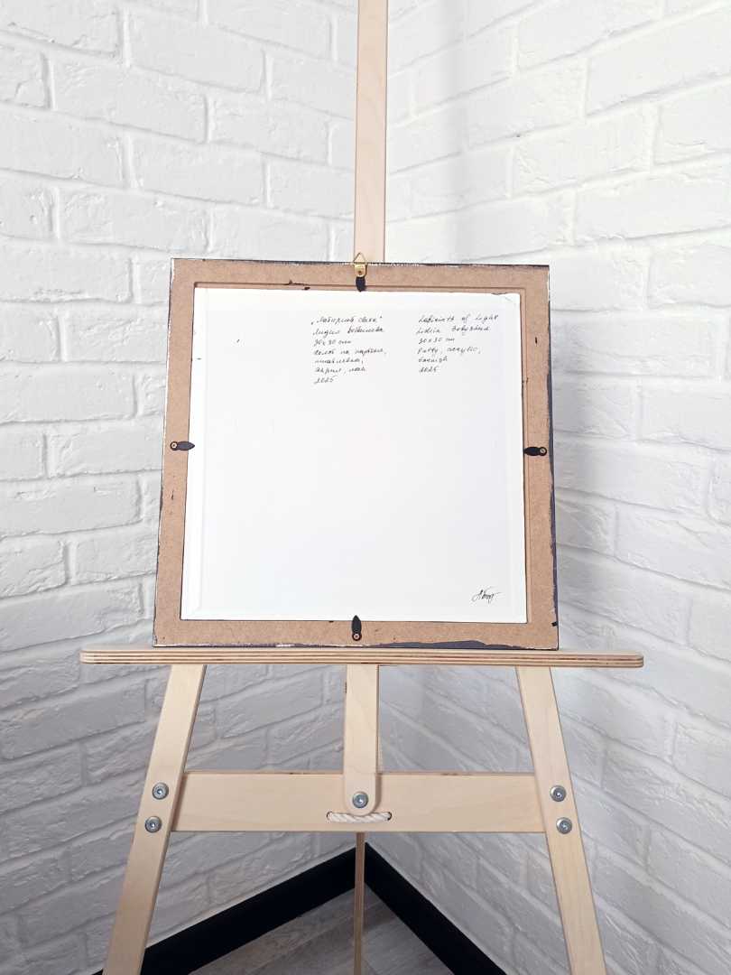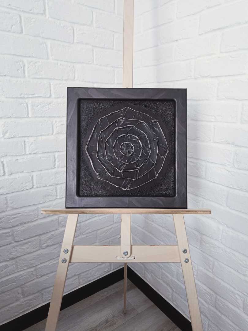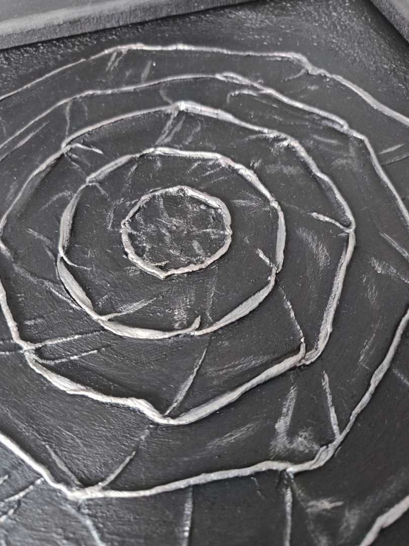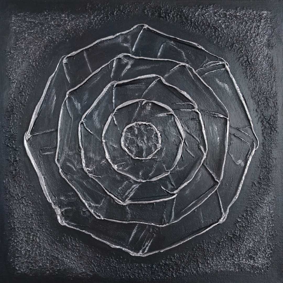 На картине изображены пять восьмиугольников, один в другом, закрученные в спиральный лабиринт. Этот жемчужно-коричневый геометрический узор на черном фоне олицетворяет путь к себе, к своей внутренней гармонии, ясности и свету.