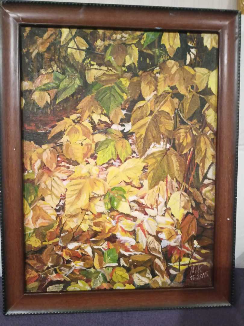 На картине изображена осенняя листва. Клен и дубовые листья. Отражено пространство воздуха между листьями и отражение света. Картина  отлично подойдет в гостиный номер в прихожую.