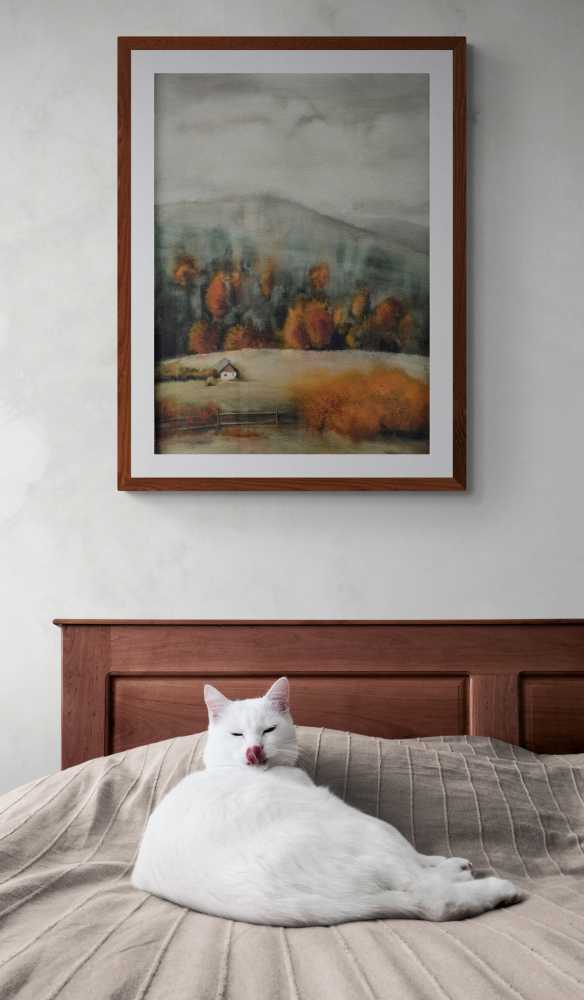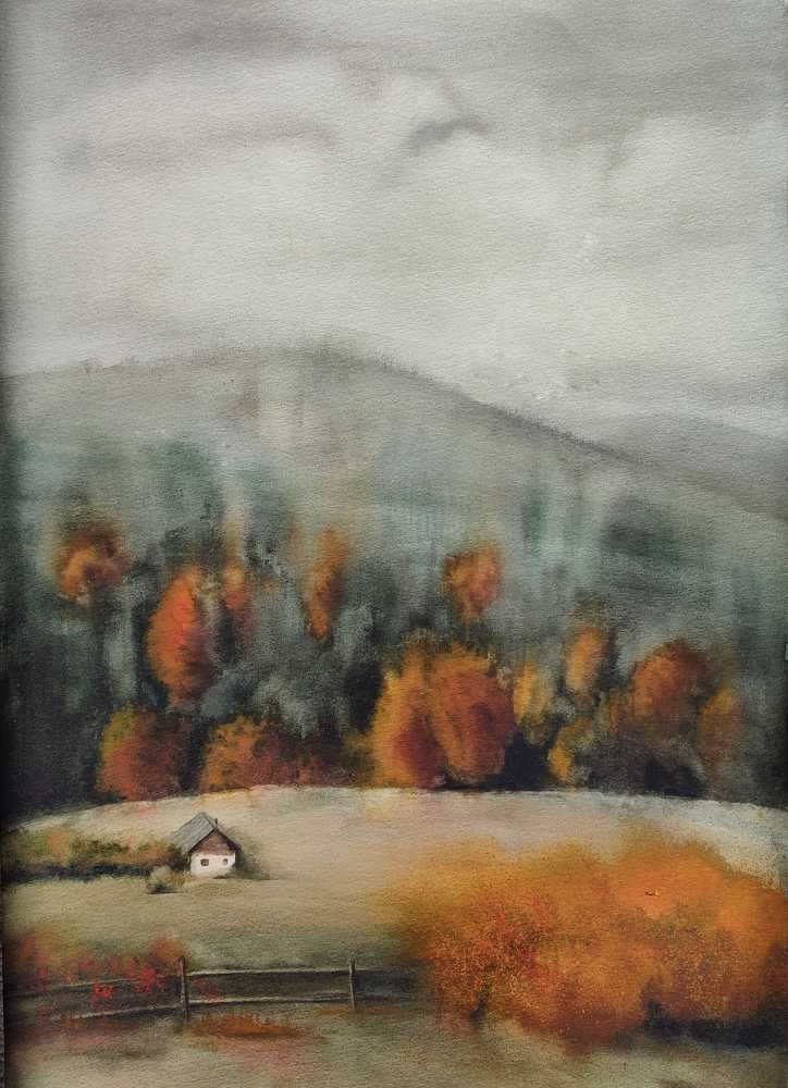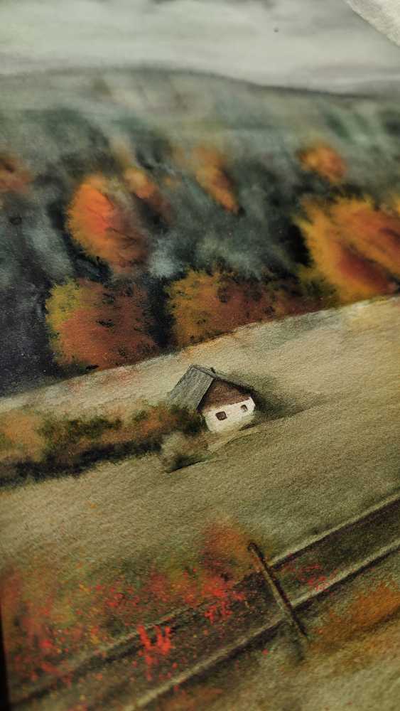 Лёгкая акварельная работа, выполненная на плотной хлопковой бумаге. В ней передано ощущение свежего, прозрачного осеннего воздуха и спокойствия деревенского пейзажа. Небольшой домик на фоне холма словно растворяется в дымке тумана, а золотисто-оранжевые деревья наполняют пространство теплом и мягким