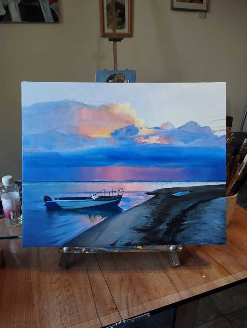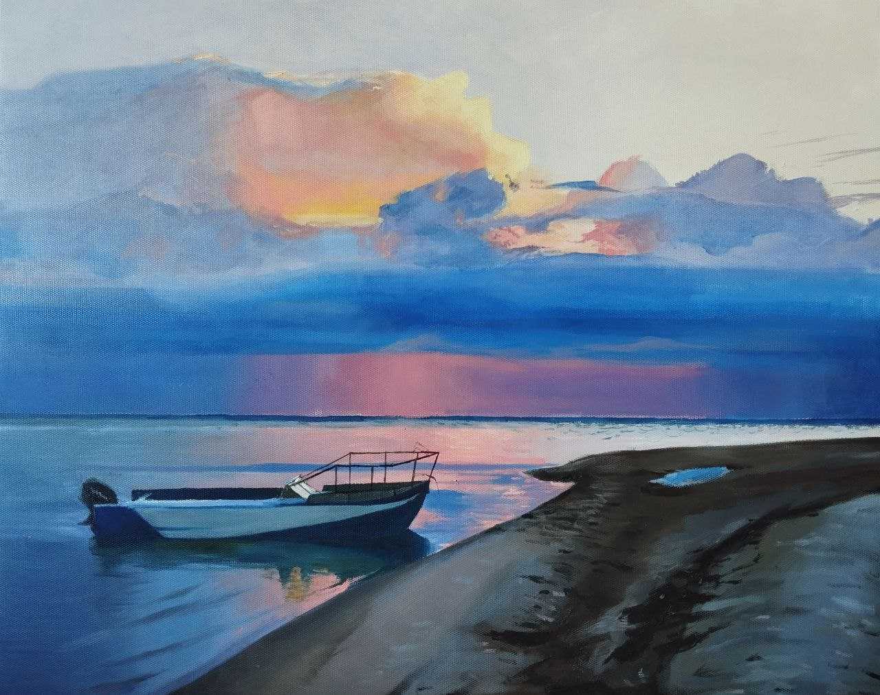 Морской пейзаж, выполненный маслом на холсте. Умиротворяющий мотив обычного дня на побережье, подходящего к концу.