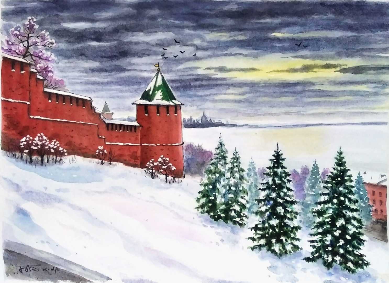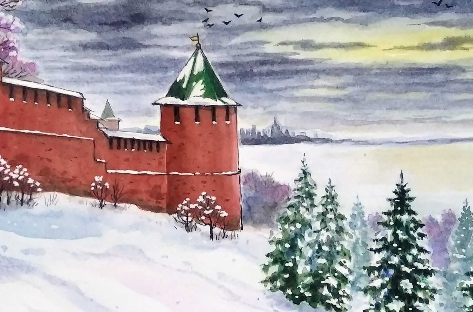 Вид на место слияния двух великих рек России - Волги и Оки. Стена кремля Нижнего Новгорода. Зима