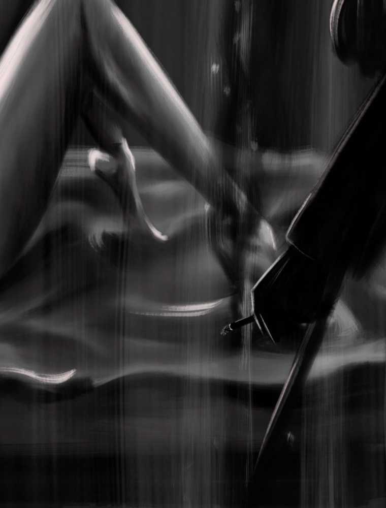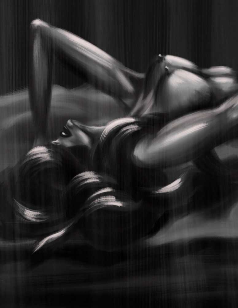 Картина наполнена тонкой эротикой и глубоким чувственным подтекстом. На ней обнажённое женское тело, утопающее в мягких тенях и лучах света, словно растворяется в потоках дождя или ночных размытых бликах. Грациозная поза, изящные линии и приглушённая палитра подчёркивают уязвимость, красоту и нежнос