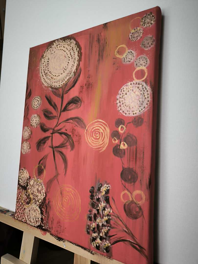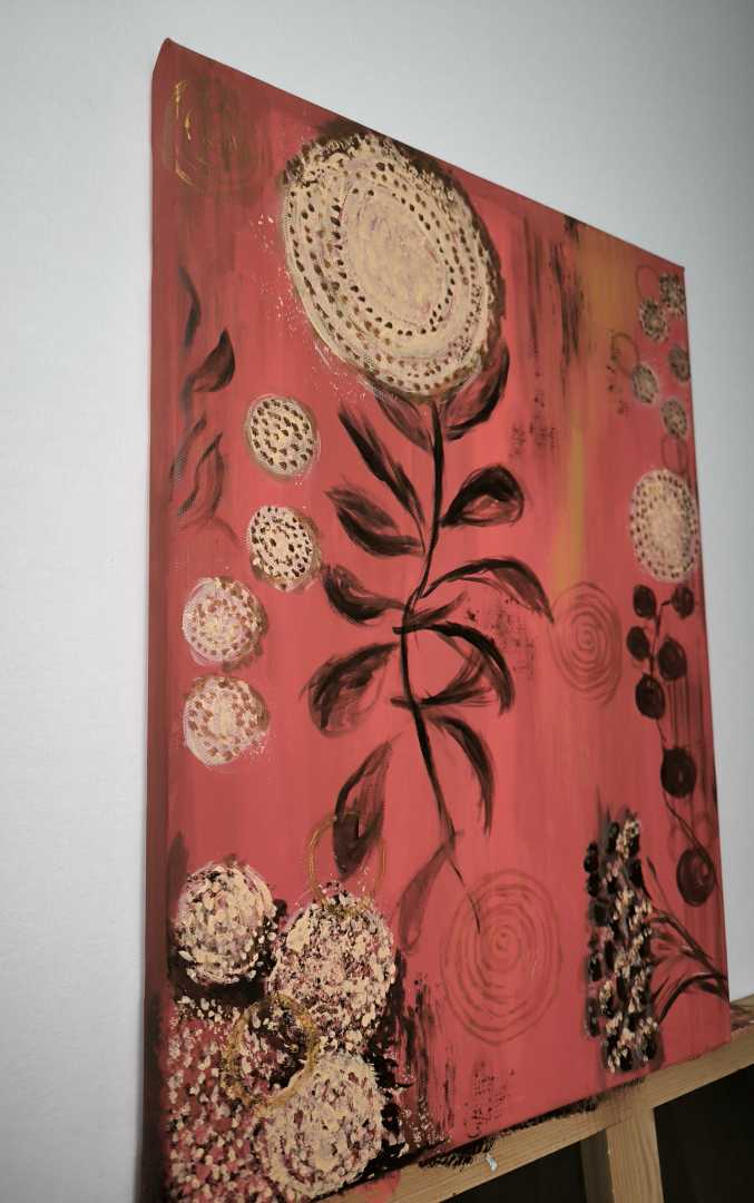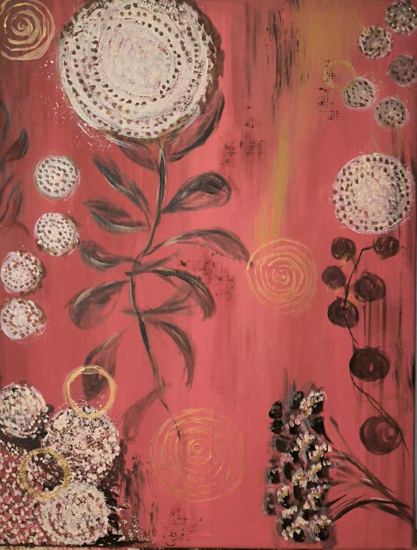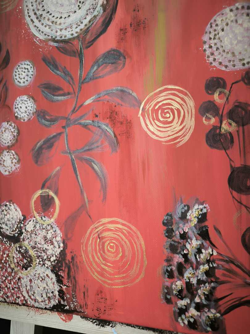 Яркая абстракция, наполненная теплом и природными мотивами. На насыщенном красном фоне расцветают нежные мотивы лета: сочные ягоды, изящные листья и лёгкие, словно пух, отпечатки одуванчиков. Золотые завитки добавляют композиции роскоши и глубины.