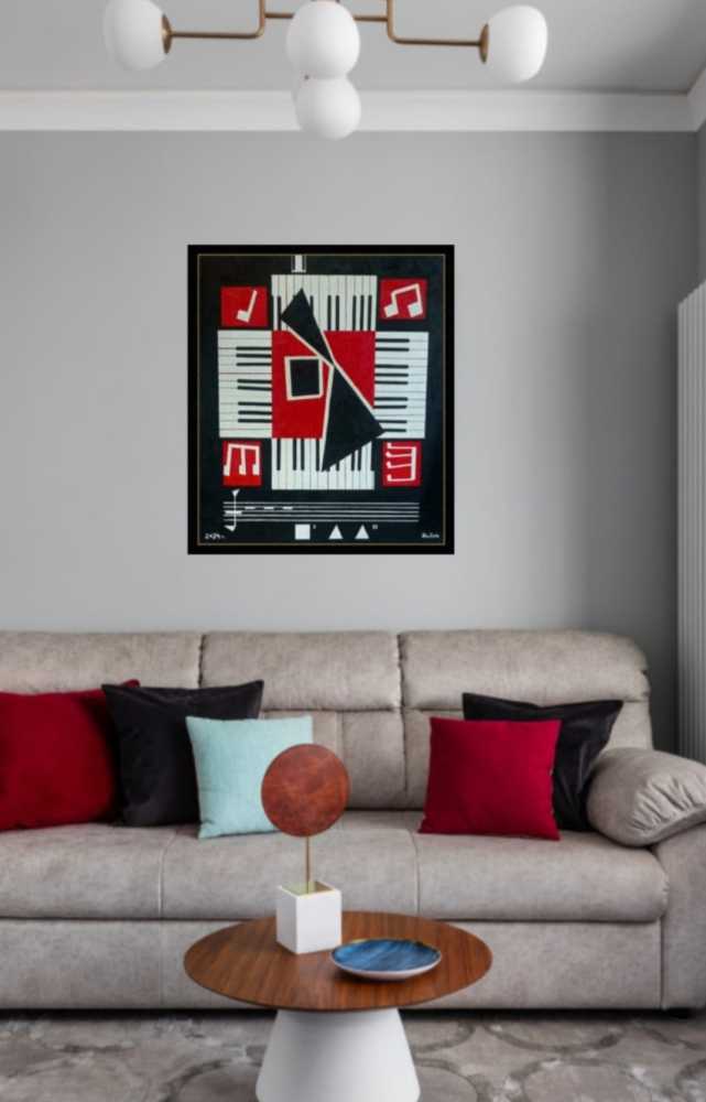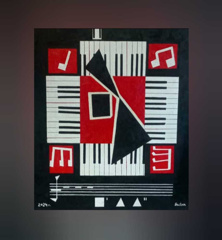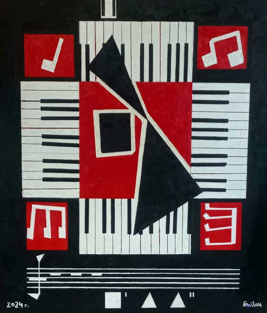 На картине встречаются два гения - К. Малевич и Джон Кейдж. Знаменитое произведение Дж.Кейджа "4 минуты и 33 секунды тишины" звучит на чёрном квадрате Малевича. Здесь звучит тишина!