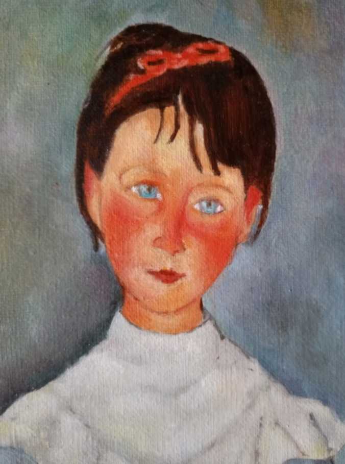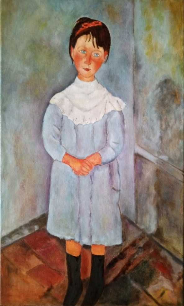 Свободная копия картины Амадео Модильяни Девочка в голубом. Масло, холст на подрамнике, 30х50. Боковинки холста прокрашены, можно обойтись без рамы. Картина в наличии, но к продаже она будет готова к концу ноября, картину еще нужно просушить и покрыть лаком. Картина находится в Лыткарино, Московской