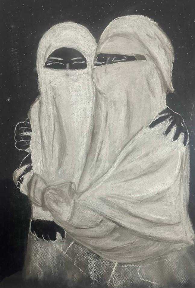 Только глаза и руки остаются открытыми — они говорят о поддержке и человеческом тепле, которое никакая ткань или тьма не способна скрыть. Картина — это нежное утверждение: даже в самых строгих рамках есть поддержка и связь
