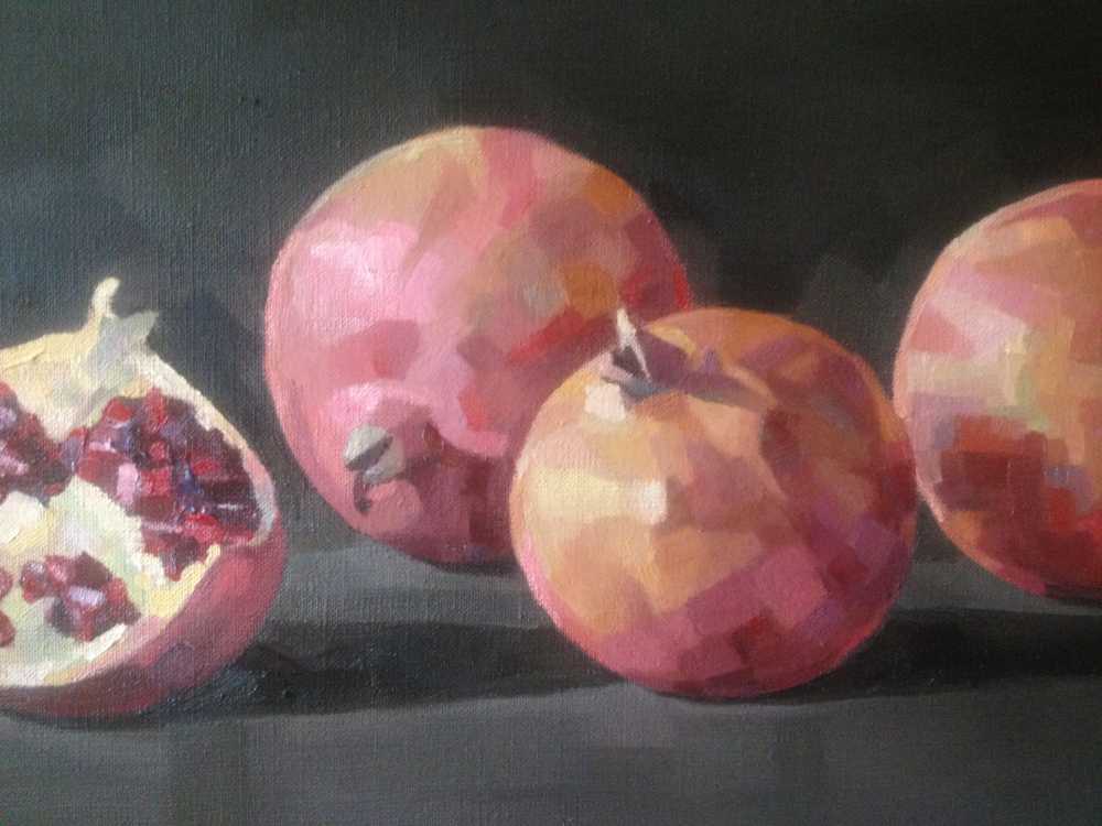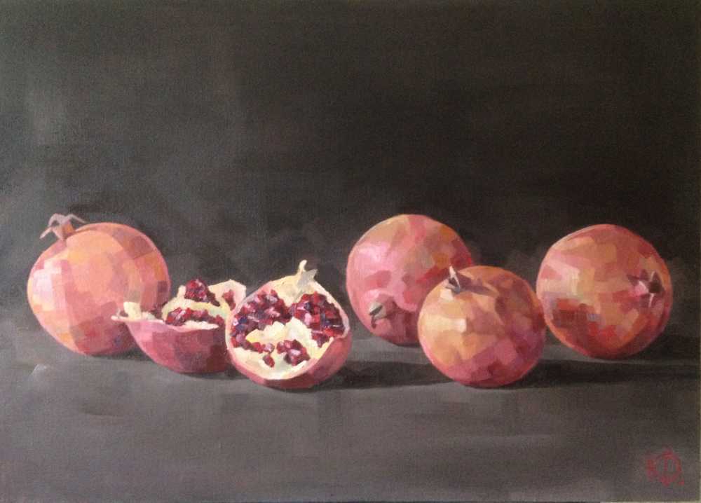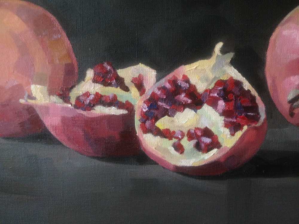 Натюрморт горизонтальный, Гранаты на тёмном фоне. Цвета: красный, коричневый.