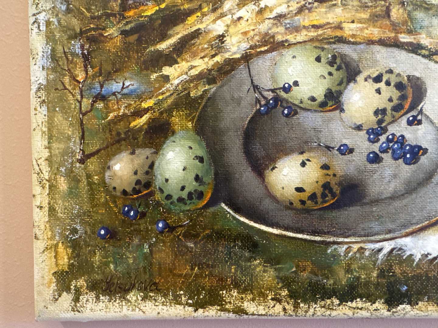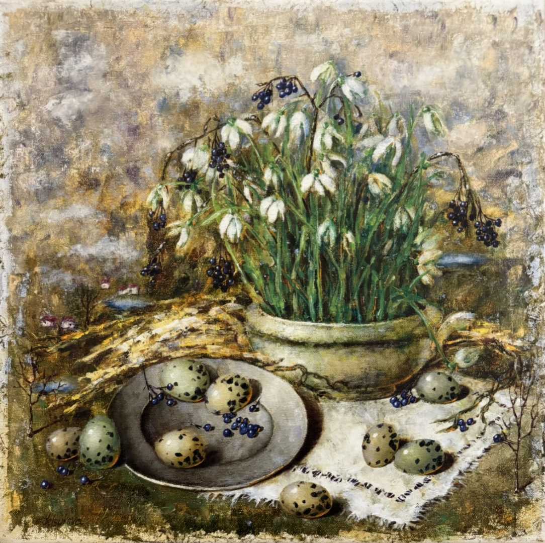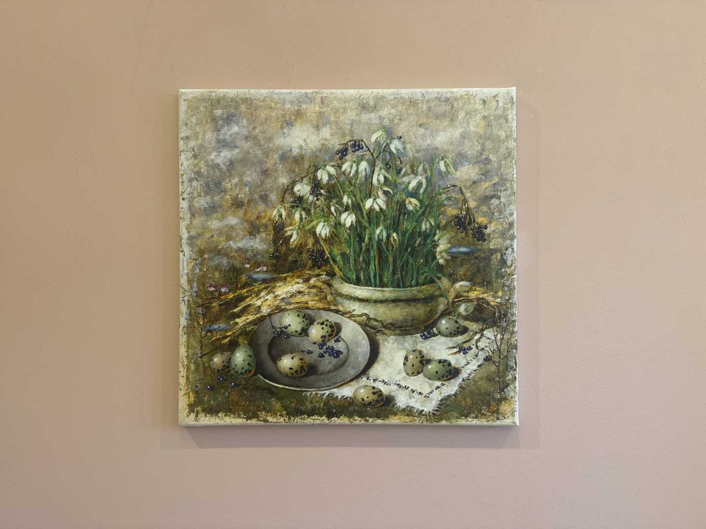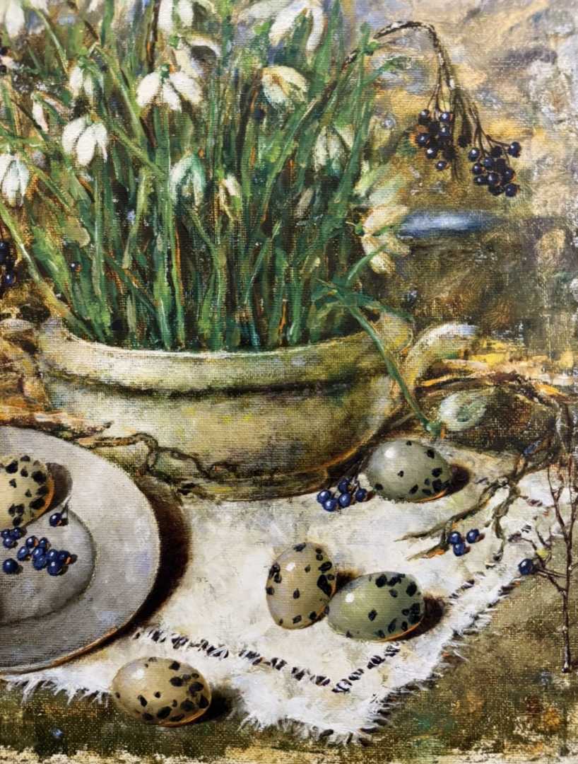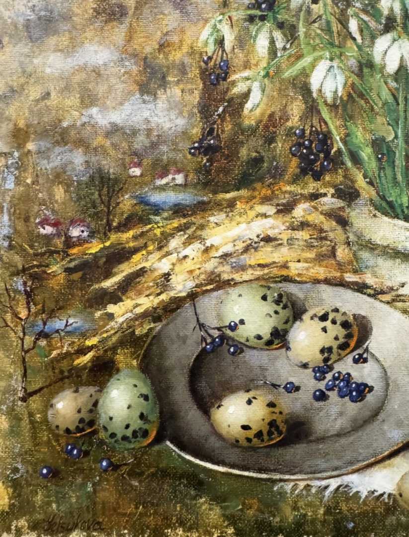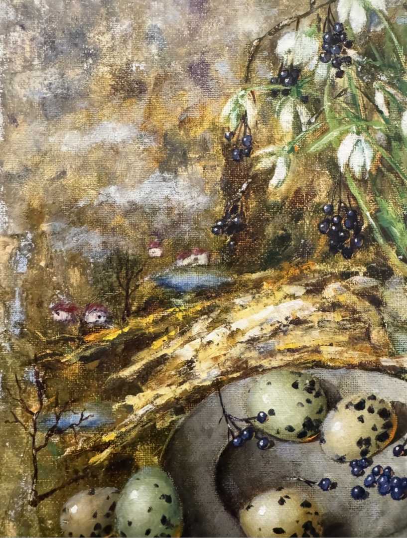 Работа написана с натуры.Натюрморт на фоне пейзажа дополнила изображениями маленьких деревенских домиков у озера.