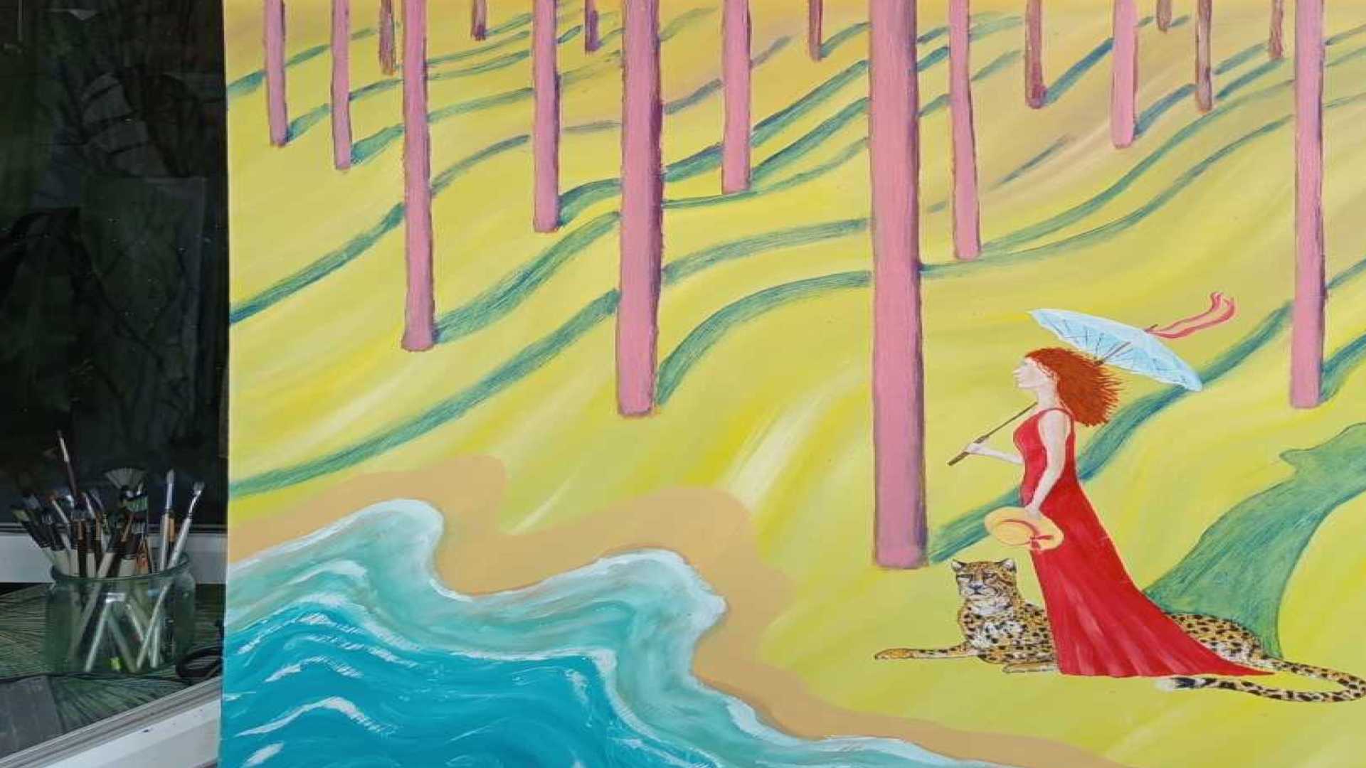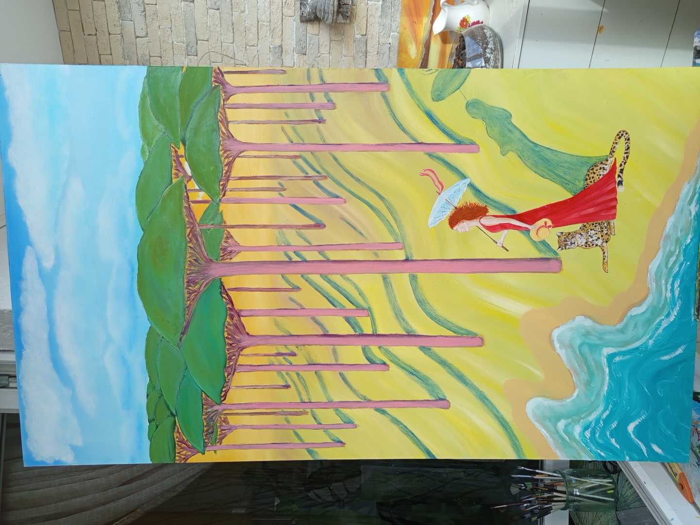 Сюрреалистическая картина с фантазийным пейзажем и символическим сюжетом, выполненная маслом на холсте. Необычные деревья на тонких опорах, береговая линия и фигура с зонтом создают ощущение сна и внутреннего путешествия. Яркая цветовая гамма и условное пространство делают работу выразительным акцен