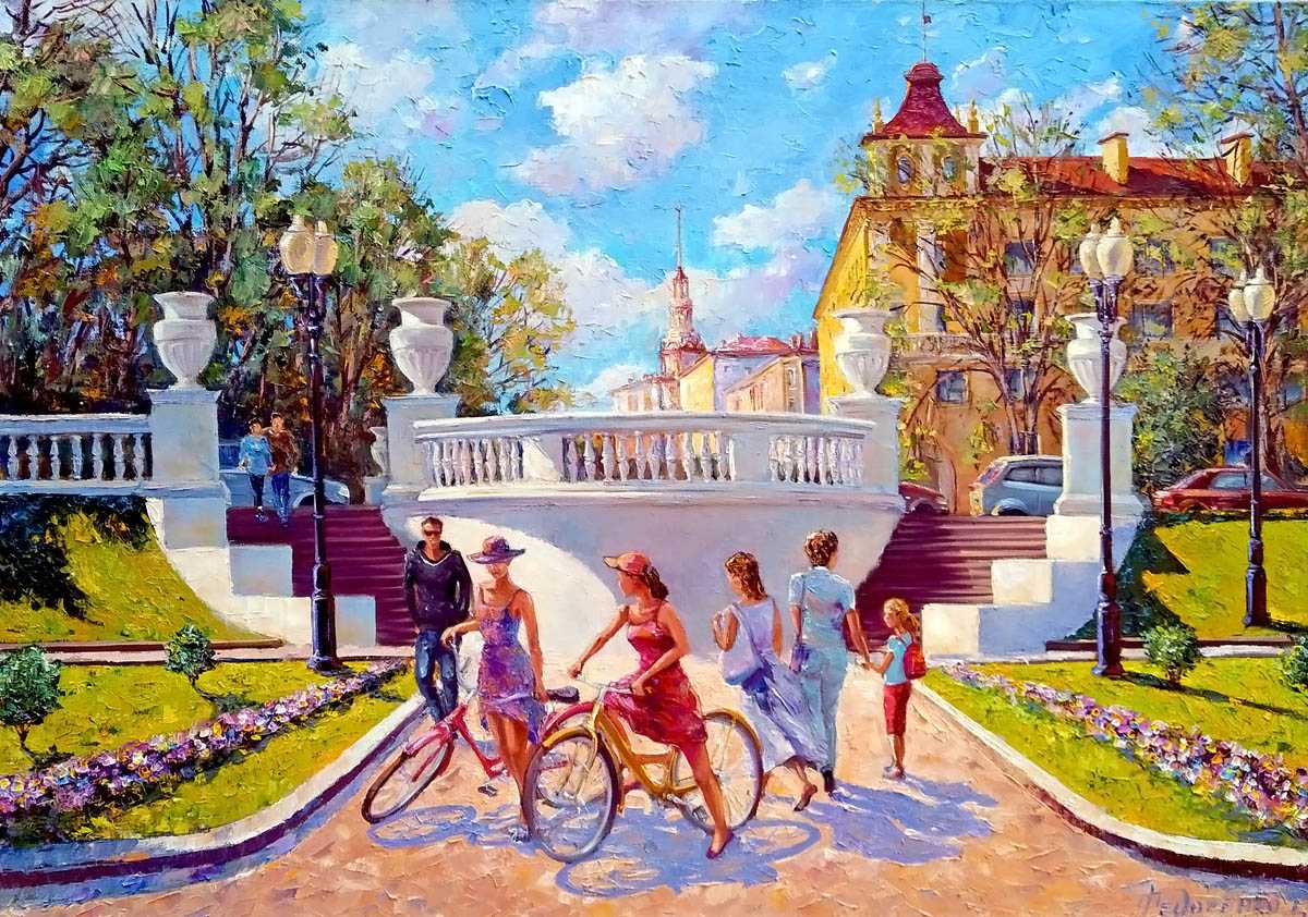 На полотне царит атмосфера легкой, солнечной безмятежности. Светит яркое, послеполуденное солнце, заливая все вокруг золотистым светом. Его лучи пробиваются сквозь молодую, еще нежную листву на деревьях, создавая игру света и тени, которая придает глубину и объем всей композиции. Эта молодая зелень