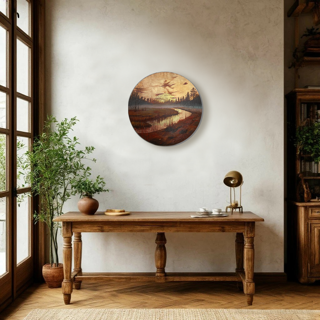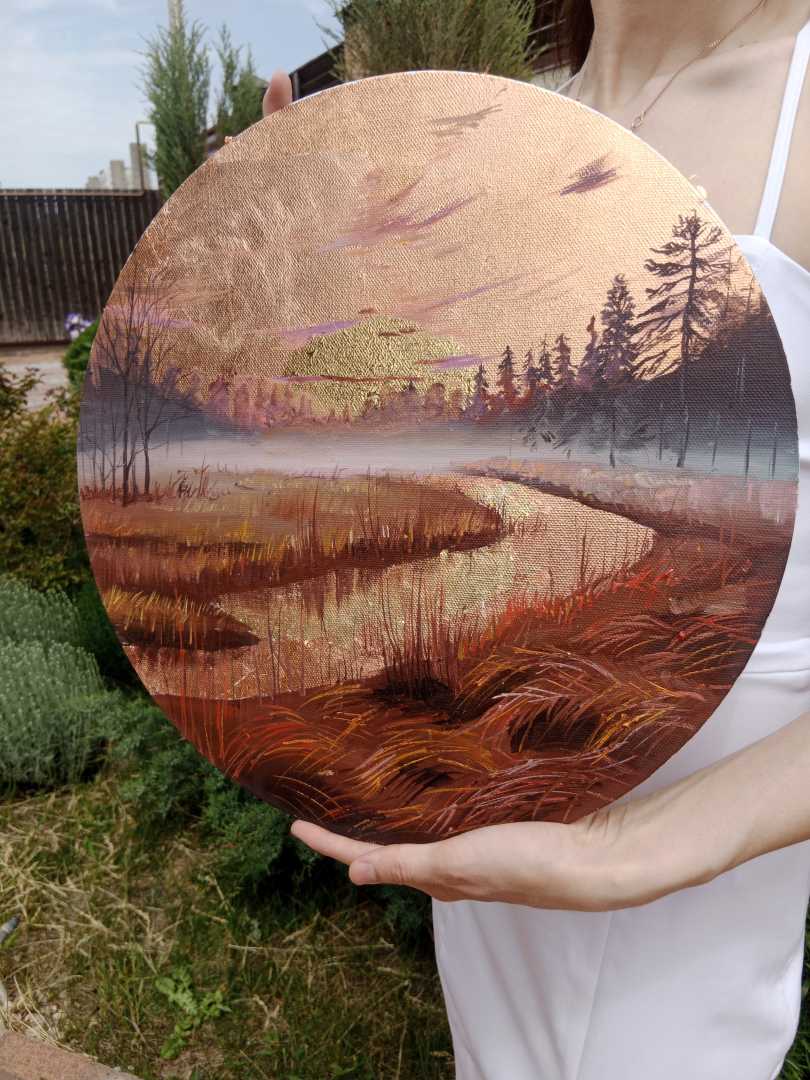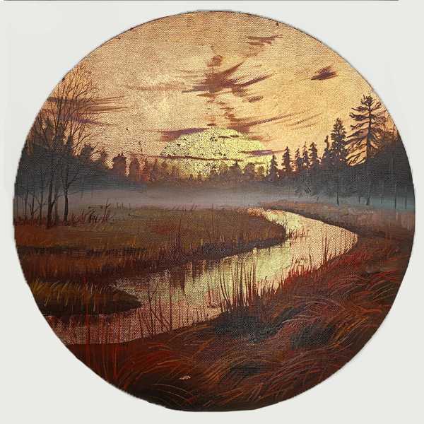 медный закат, закат, пейзаж, река, поталь, картина с поталью, картина маслом, авторская живопись, реализм, вечер, природа, холст, ручная работа, теплые тона, современный интерьер, Москва, Россия, поталь, масло, рассвет, закат, подарок, медь, бронза, осень, лес, река