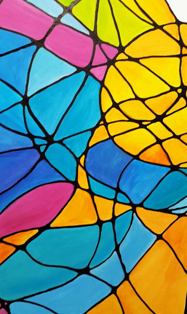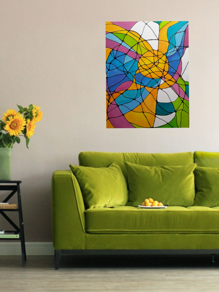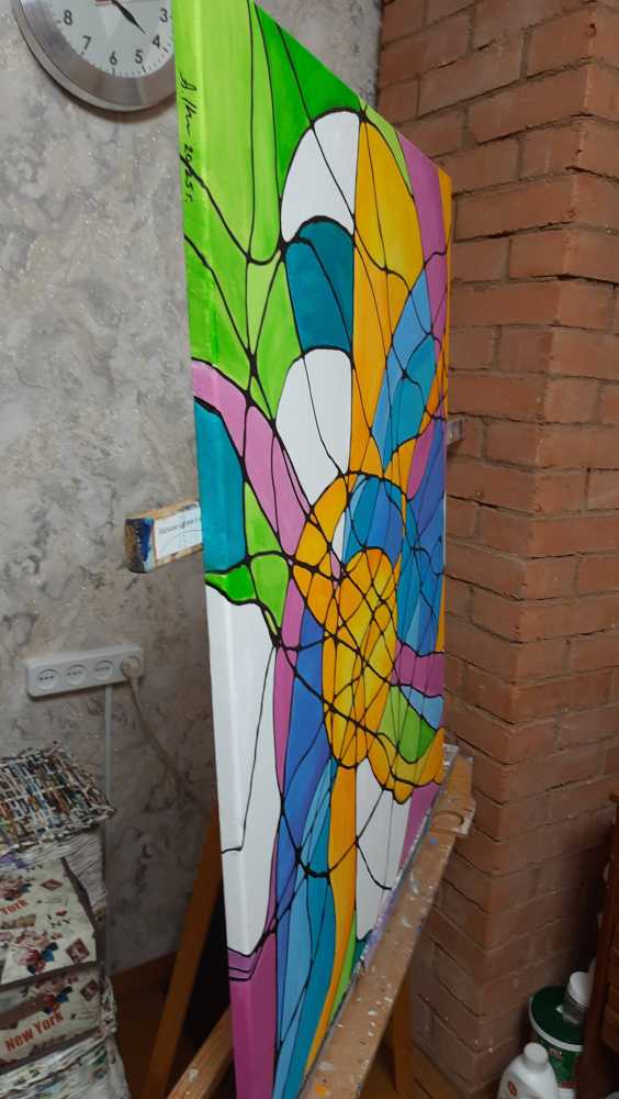 Яркая абстрактная работа, вдохновлённая витражной эстетикой. Переплетение цветовых форм и чётких линий создаёт ощущение движения, глубины и света, словно картина наполнена внутренней жизнью.