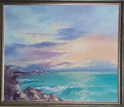 Морской пейзаж выполнен масляными красками мастихином и кистью. Основа- холст на картоне. Размер 40х30 см.