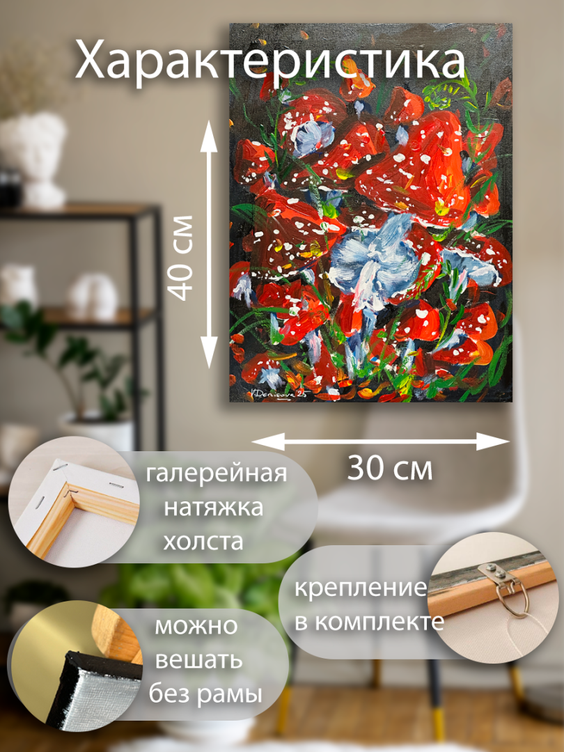 Комплектация включает в себя удобное крепление, позволяющее легко повесить картину на стену. Более того, благодаря своей универсальности, полотно может быть размещено как в раме, так и без нее, что дает свободу выбора в оформлении пространства.