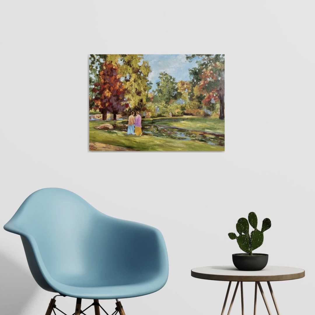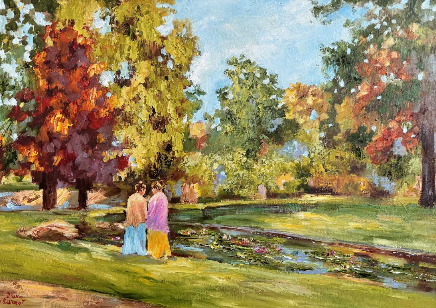 Картина «На берегу пруда» Дианы Маливани написана в стиле импрессионизма маслом на холсте. Летний солнечный день, отражения света на воде и золотистые деревья передают атмосферу спокойствия и вдохновения. Этот живописный пейзаж идеально подойдёт для интерьера гостиной, спальни или кабинета, добавив