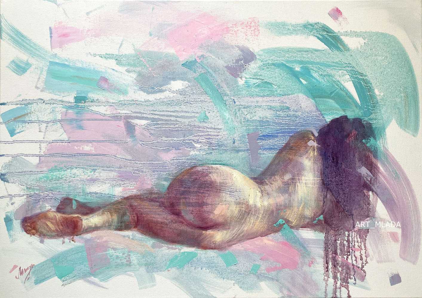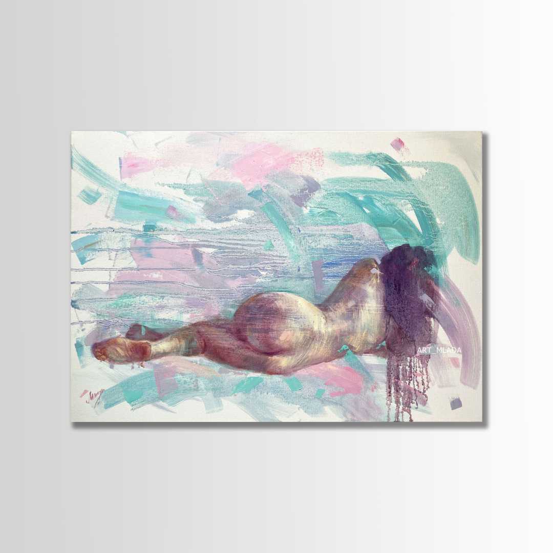 Картина в жанре ню с изображением лежащей натурщицы. Нежное разноцветие рождает