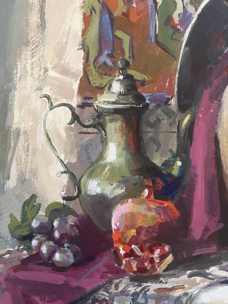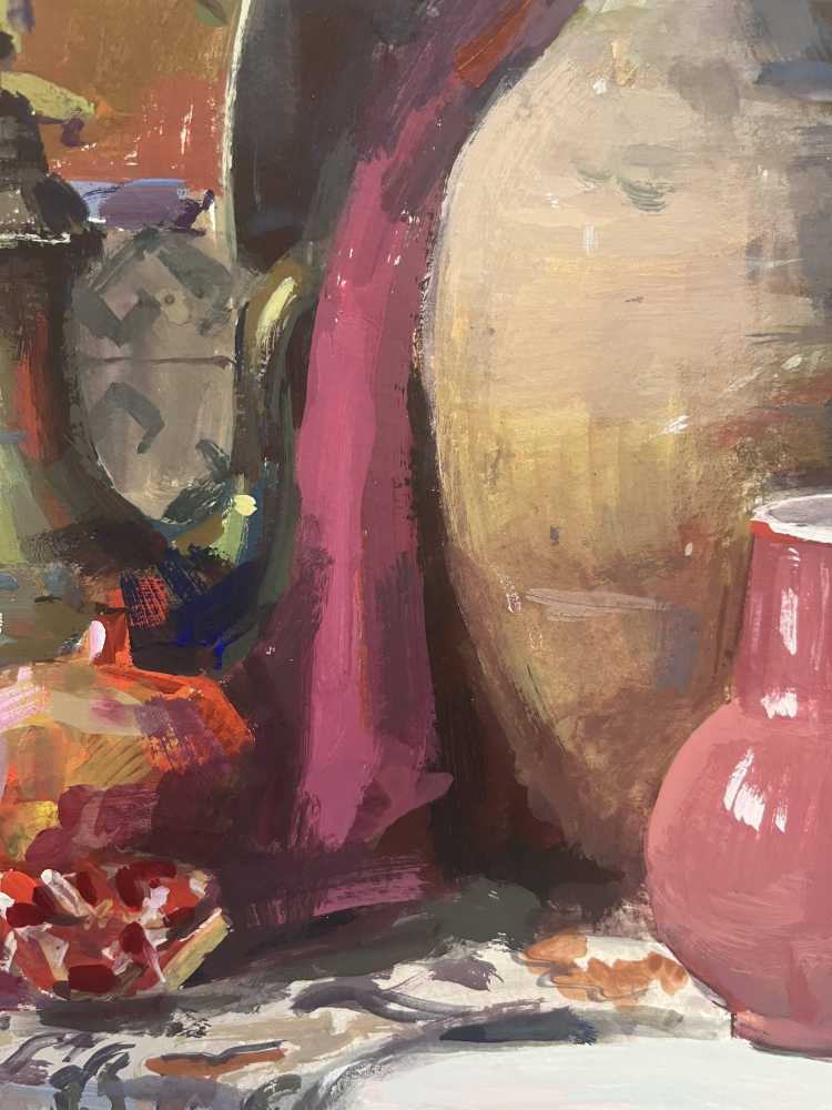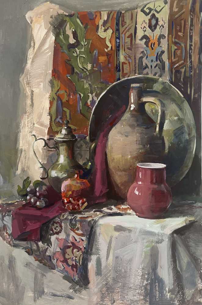 Декоративный натюрморт, вдохновлённый эстетикой Востока. Орнаментальные ткани, керамические сосуды и мягкий свет создают атмосферу загадочности и утончённого уюта.