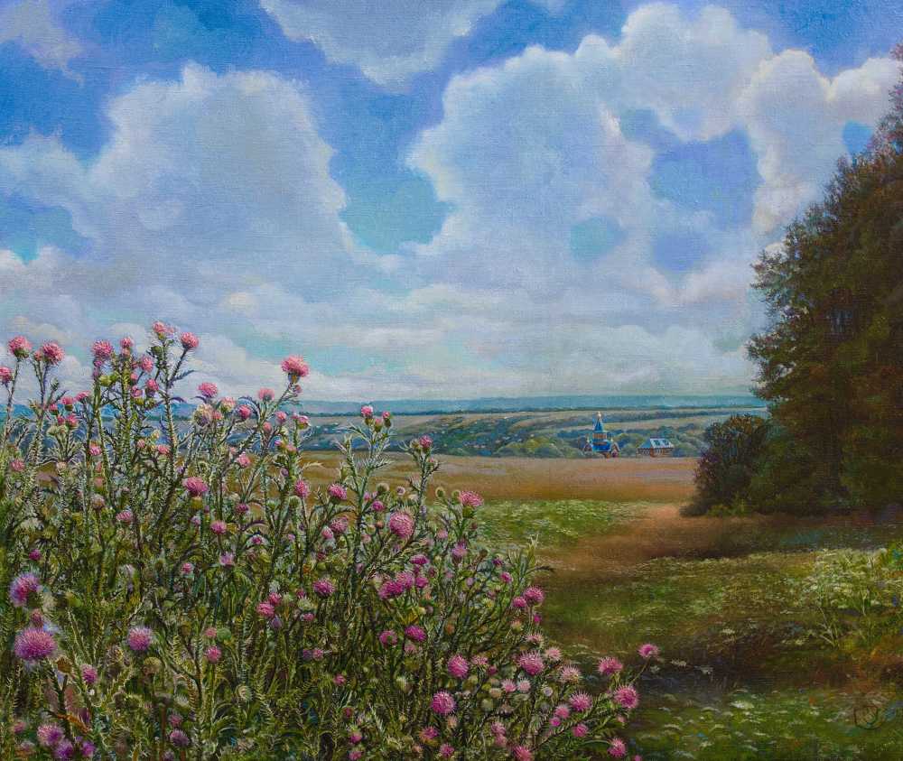 Картина «Недалеко от Тольятти» — светлый пейзаж, передающий ощущение простора и спокойствия русской природы. Цветущие полевые растения на переднем плане, мягкие холмы и далёкий горизонт создают глубину и воздушность пространства. Широкое небо с лёгкими облаками наполняет композицию светом и ощущение
