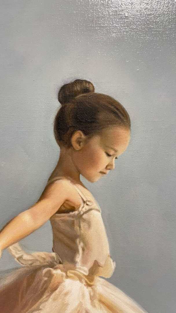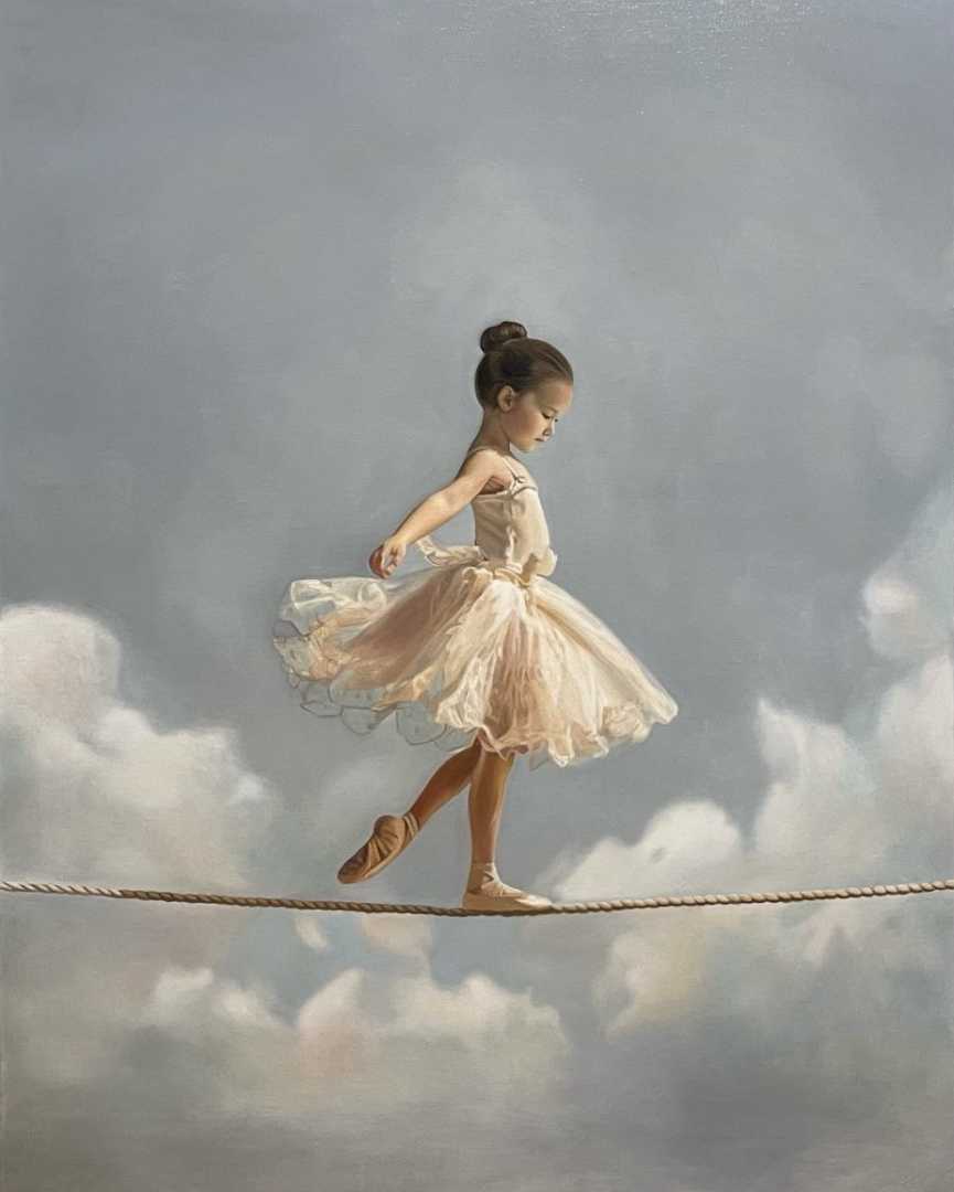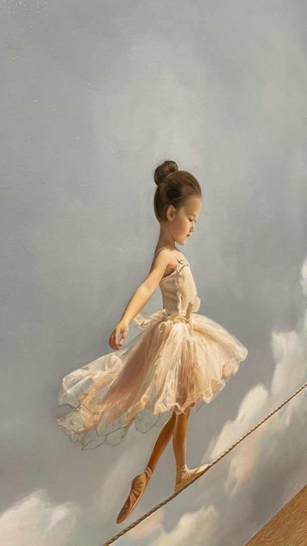 Авторская картина маслом на холсте — изящный образ юной балерины, сохраняющей равновесие на тонком канате среди пушистых облаков. Работа выполнена ручной техникой масляной живописи с тонкими полупрозрачными слоями и локальным импасто в текстуре