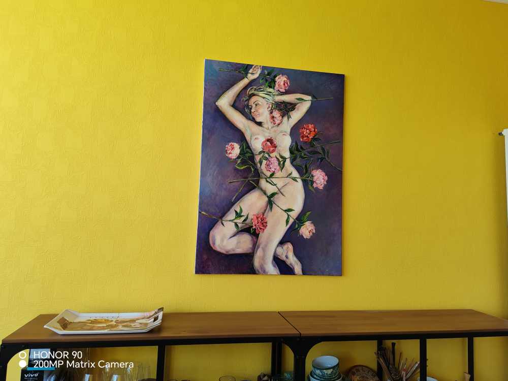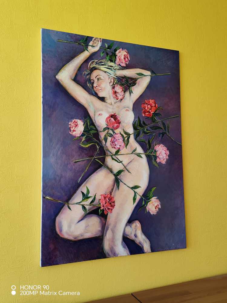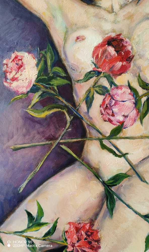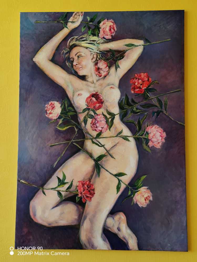 Обнажённая фигура переплетается с ветвями и пионами, создавая образ единства тела и природы. Мягкая пластика форм, насыщенный фон и цветочные акценты придают картине чувственность и эмоцион