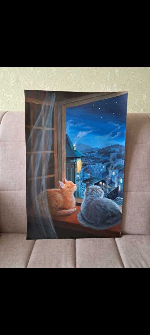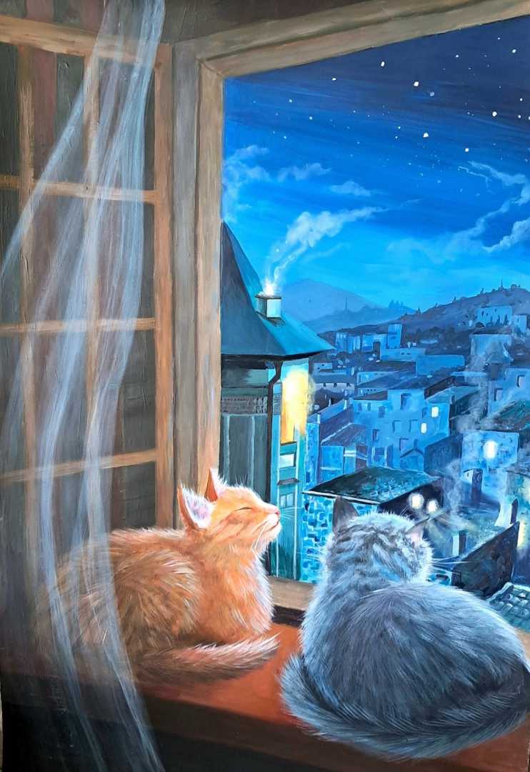 На картине запечатлён уютный вечерний момент: две кошки расположились на широком подоконнике и смотрят в окно.