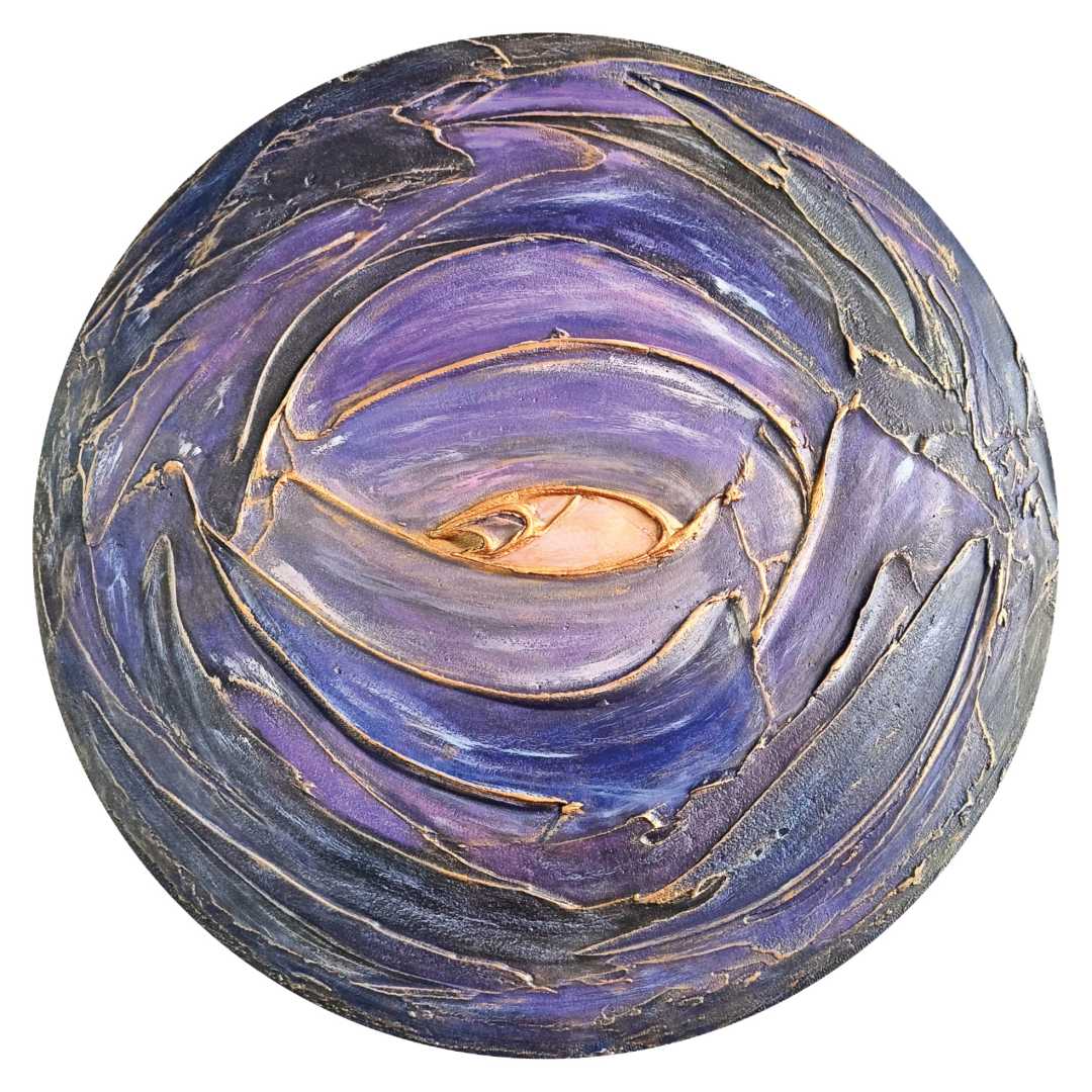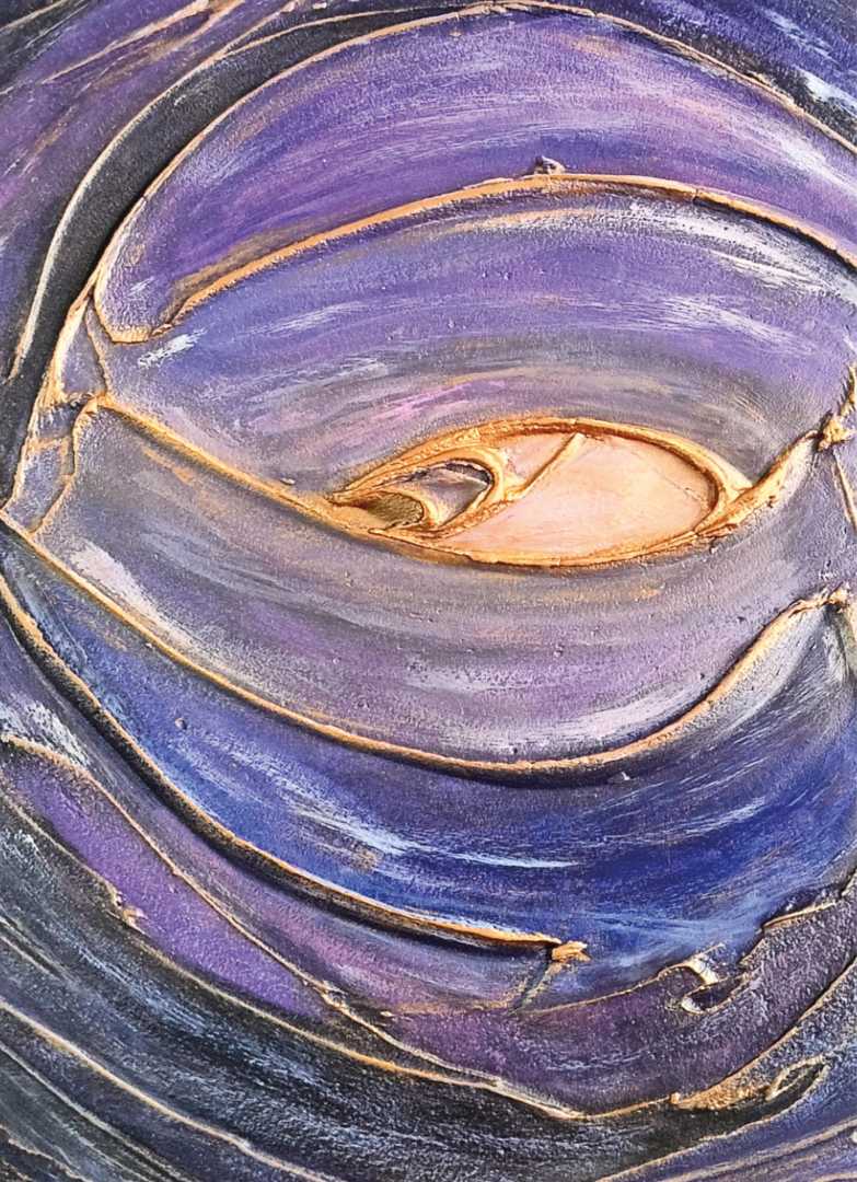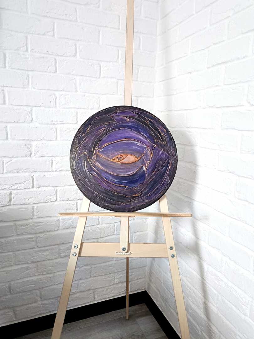 Картина в глубоких сине-фиолетовых тонах с золотистым центром. Фактурные мазки напоминают космический вихрь. Картина символизирует бесконечность космоса и его всевидящее присутствие, соединяя абстракцию с мистикой.