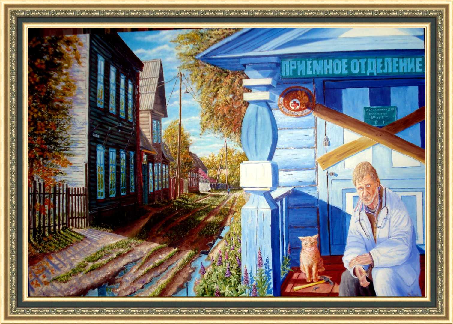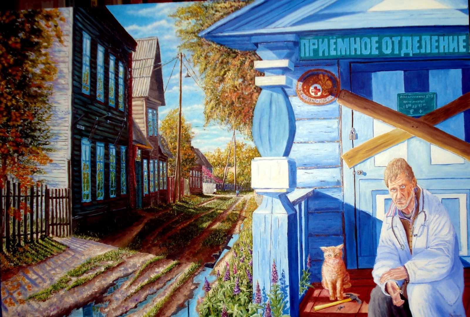 На картине изображена русская деревня средней полосы России, во время проведения, так называемой, реформы оптимизации медицинских учреждений (примерно с 2005 по 2015 год). В это время в сельской местности закрывались все государственные больницы и поликлиники, а медперсонал сокращался.