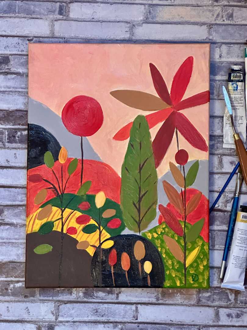 Перед вами произведение, выполненное в стиле примитивизма и наивного плоского искусства. Это направление сегодня находится на пике популярности в интерьерном дизайне, так как оно