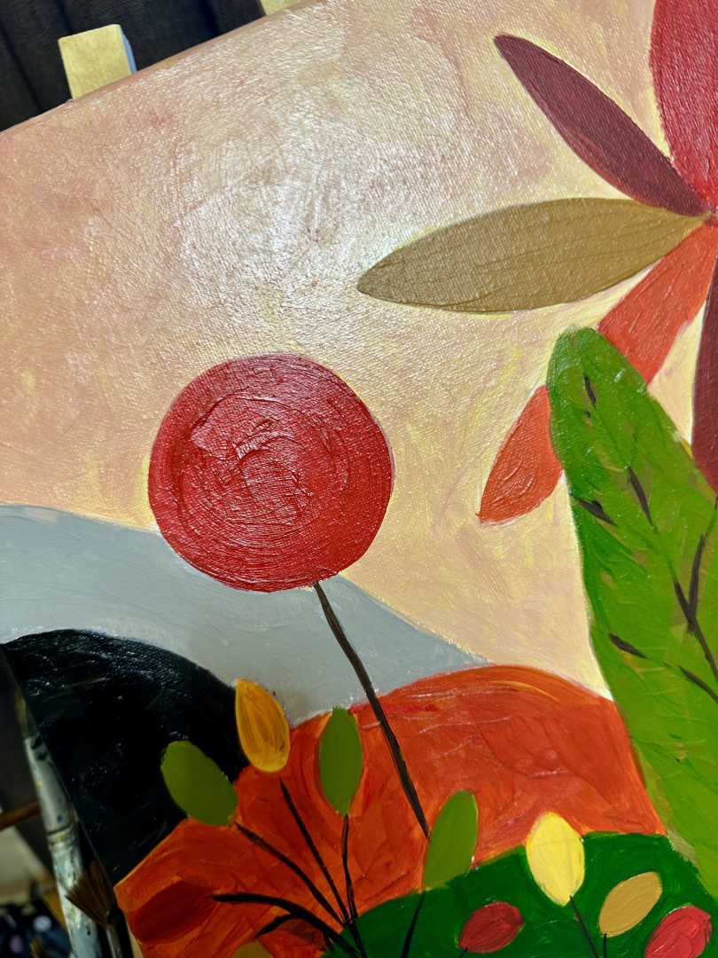 • Энергия цвета: Сочетание насыщенного алого, сочного зеленого и нежного розового фона создает мощный позитивный настрой. Эта картина способна «оживить» даже самый спокойный интерьер, став его главным смысловым и цветовым акцентом.