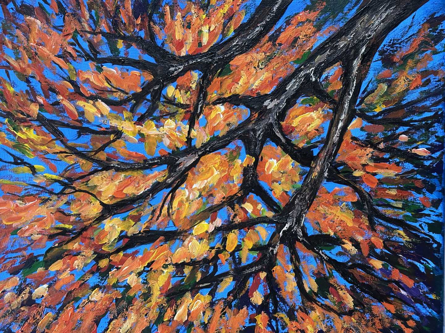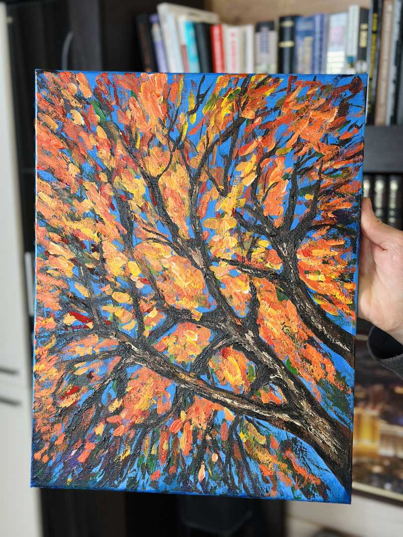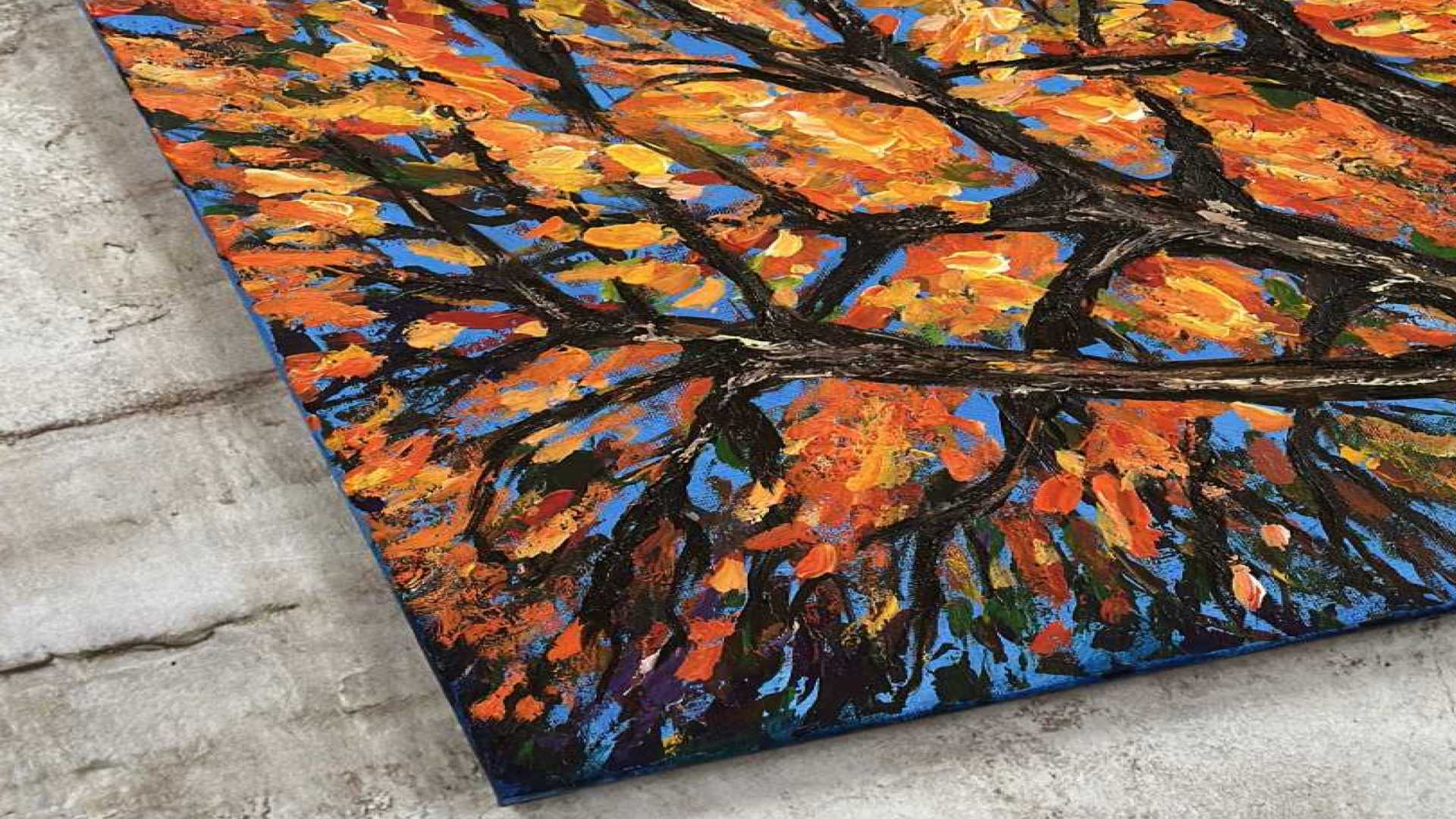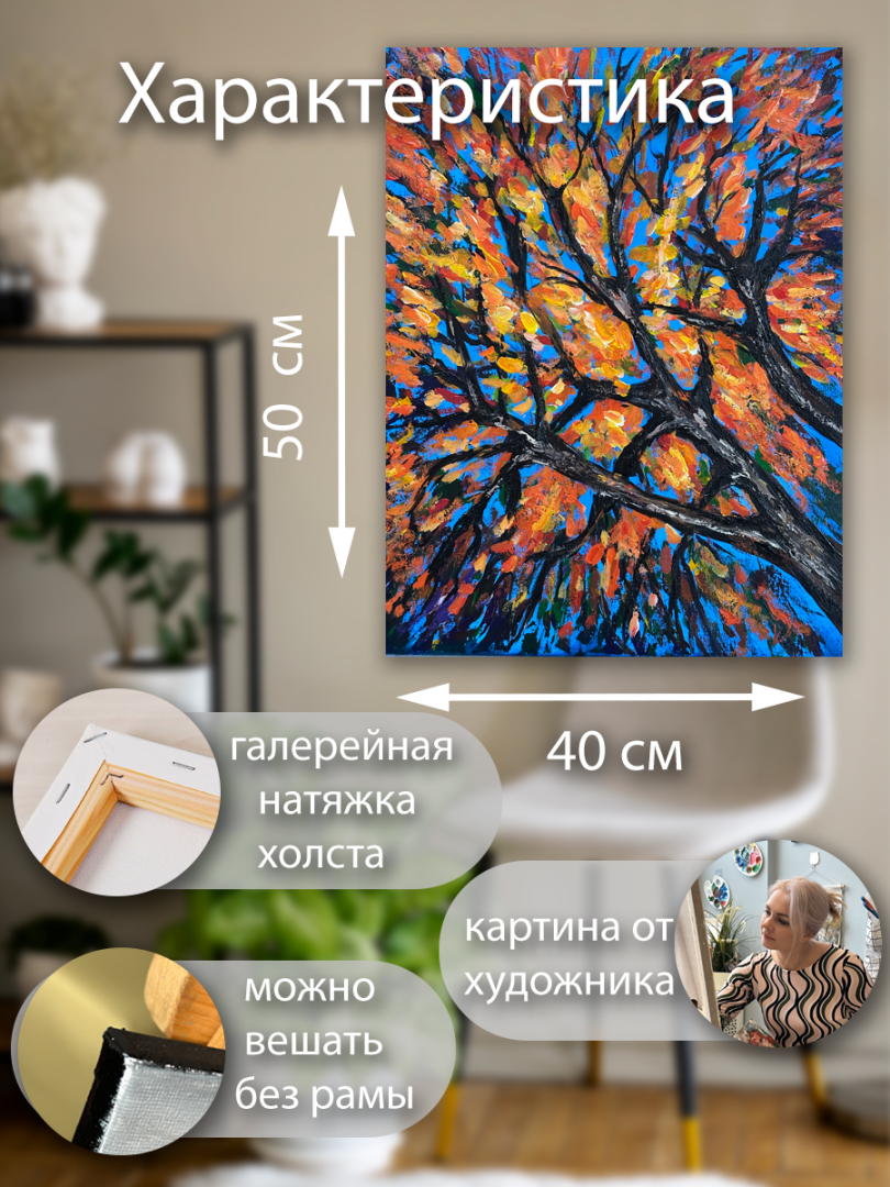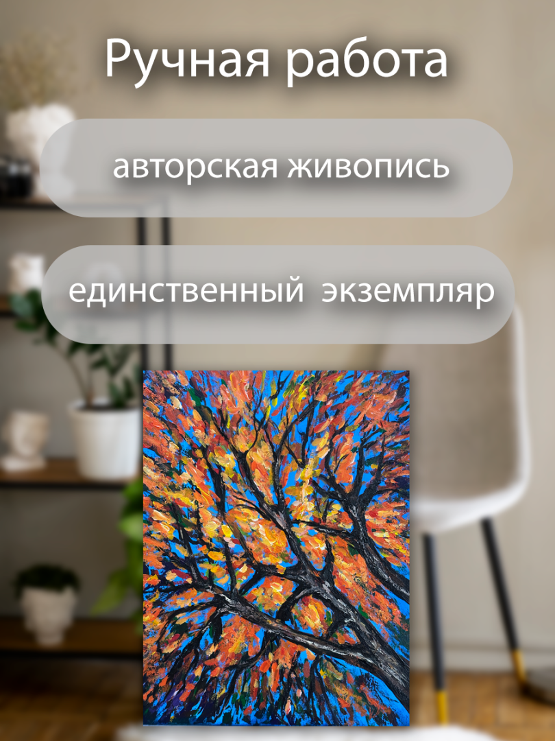 Эта картина — настоящий взрыв осеннего настроения и творческой свободы. Сюжет с ветвями дерева на фоне бескрайнего неба выполнен в манере экспресси