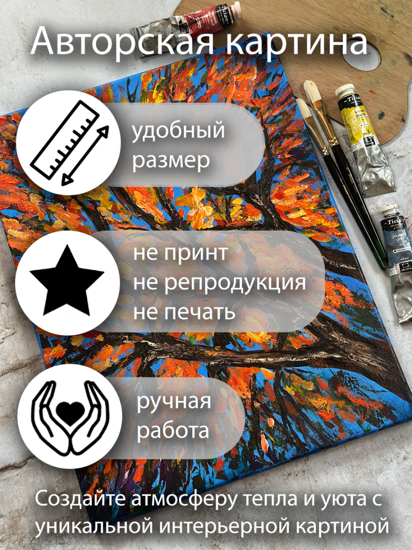 • Яркость и свет: Я использую качественный акрил. Краски не побледнеют и не выгорят со временем — дерево будет сиять на фоне неба так же ярко, как в первый день.