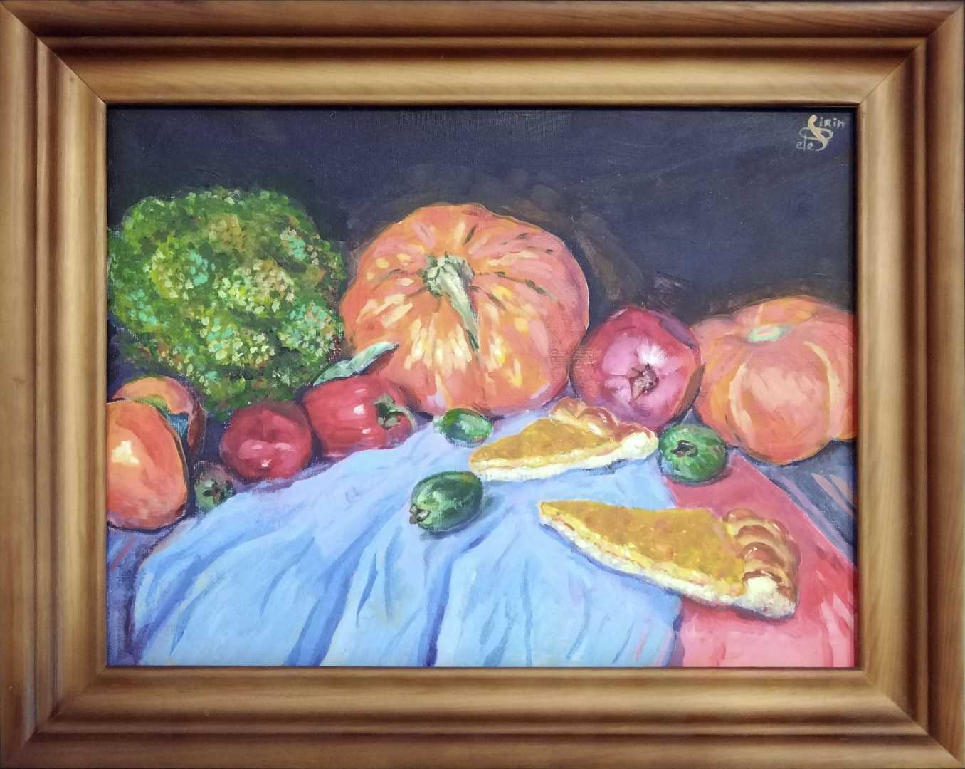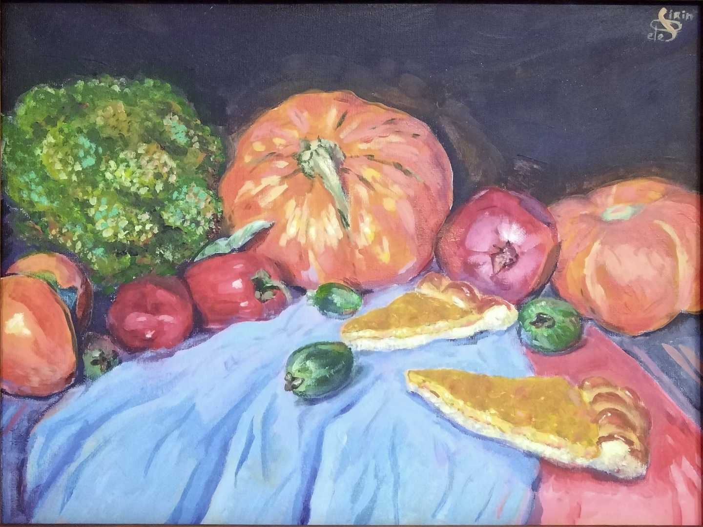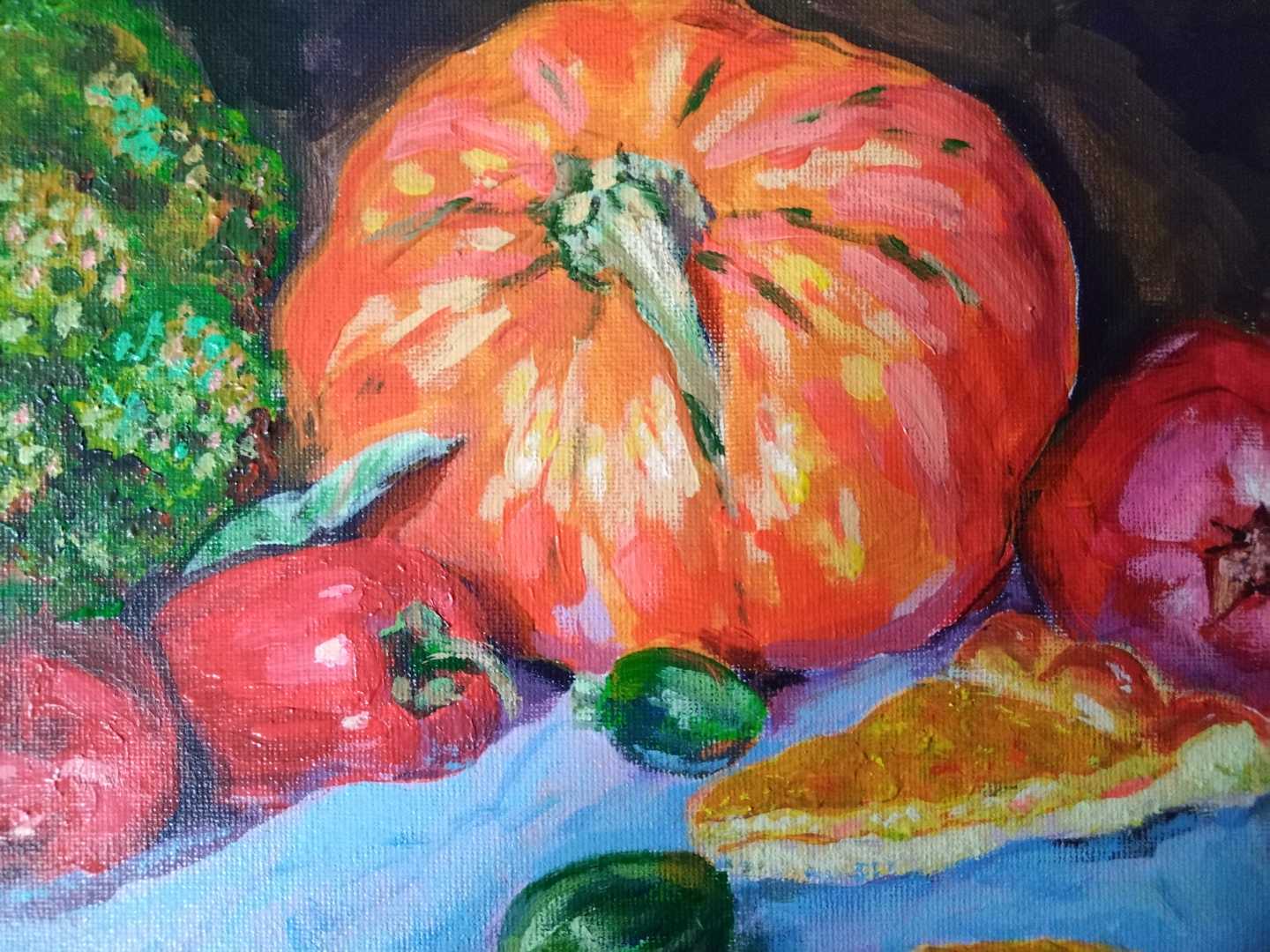 В этом натюрморте я собрала всякое вкусное и красивое, что может предложить осень. Обычно людям хочется всё это съесть, но мне хотелось именно изобразить. Я специально поехала на рынок для того, чтобы купить что-нибудь красивое и не банальное. Перцы, брокколи, гранат, хурма, фейхоа, тыквы и даже рум