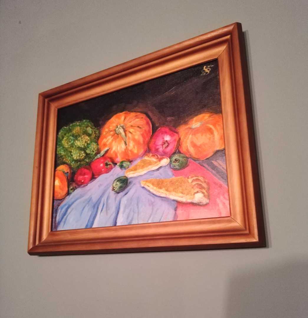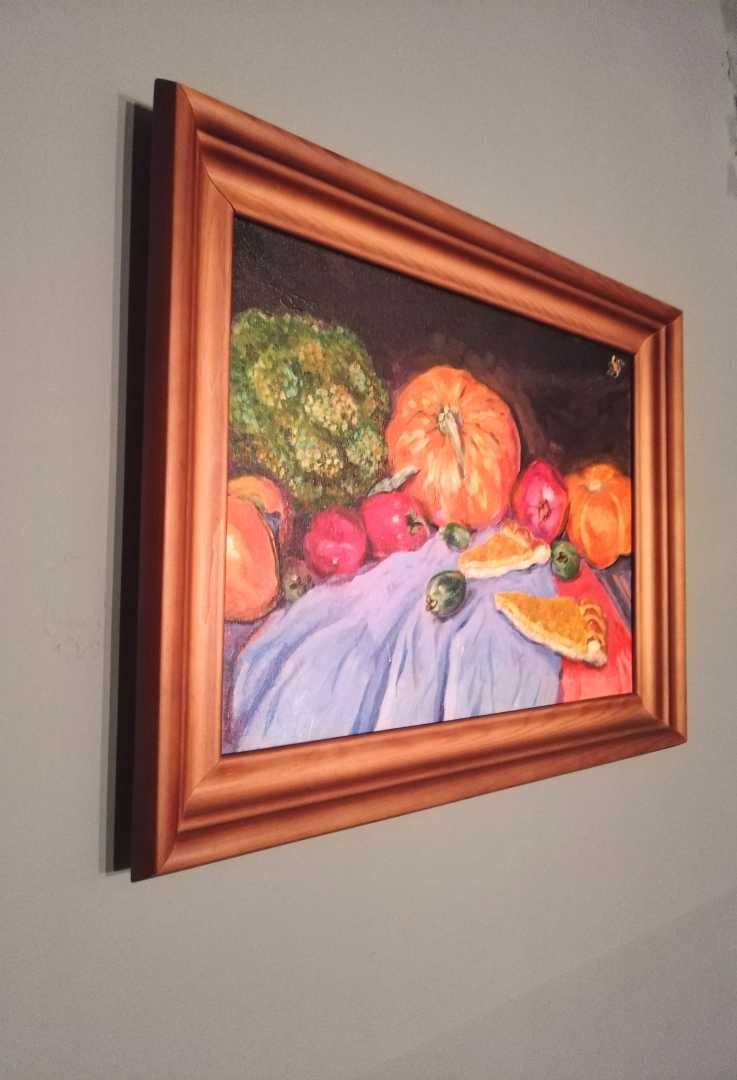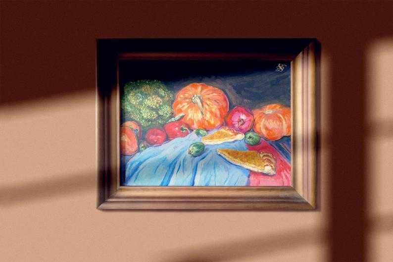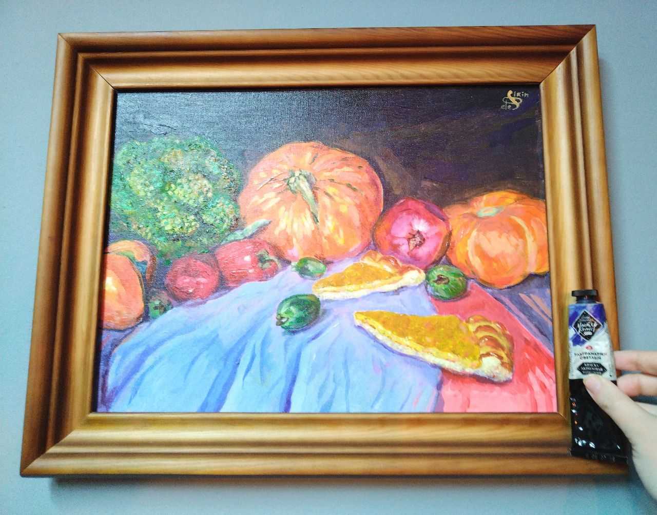 В этом натюрморте я собрала всякое вкусное и красивое, что может предложить осень. Обычно людям хочется всё это съесть, но мне хотелось именно изобразить. Я специально поехала на рынок для того, чтобы купить что-нибудь красивое и не банальное. Перцы, брокколи, гранат, хурма, фейхоа, тыквы и даже рум