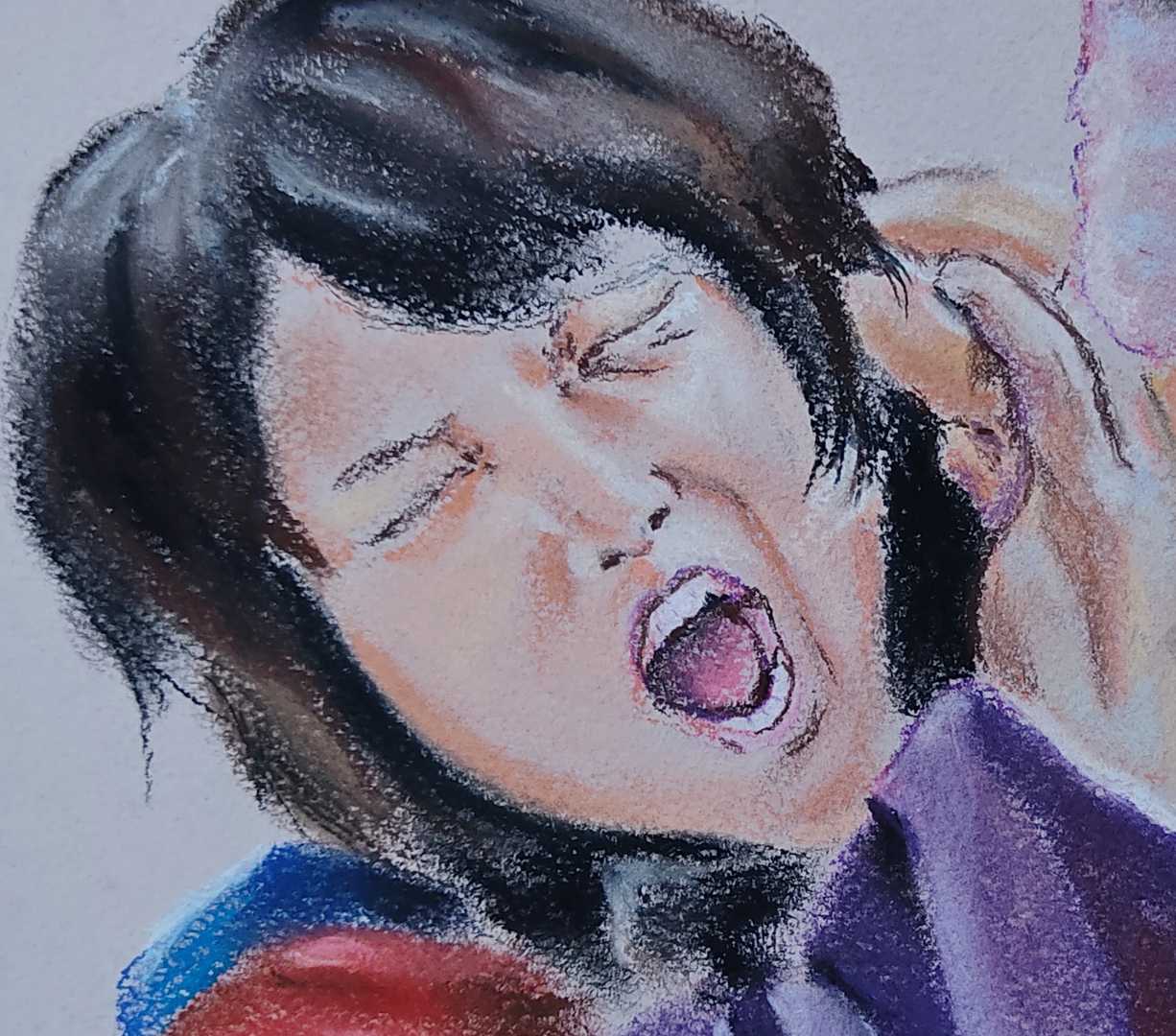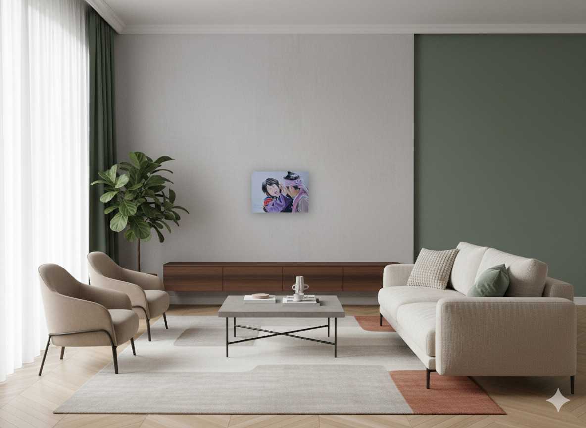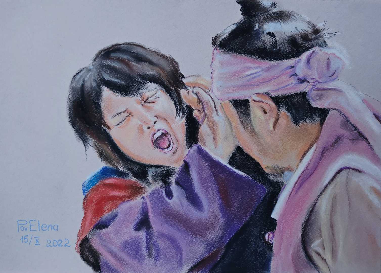 в этот сюжет. Насыщенный фиолетовый цвет одежды юноши красиво контрастирует с землистыми тонами фона, притягивая взгляд прямо к эмоциональному центру действия — крепкой хватке за ухо и шоку на лице молодого человека. Это работа, полная энергии, рассказывающая универсальную историю о взрослении, дисциплине и сложной связи между поколениями.