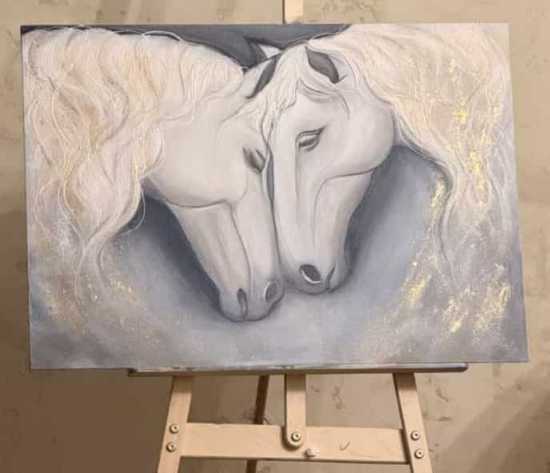 В каждом изгибе этих прекрасных животных угадывается порода , работа дополнена узорами и попоной с именными вензелями.Картина находится на выставке в Германии до конца июня 2026 года.